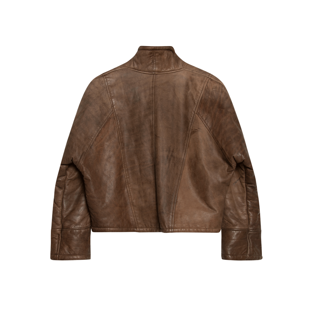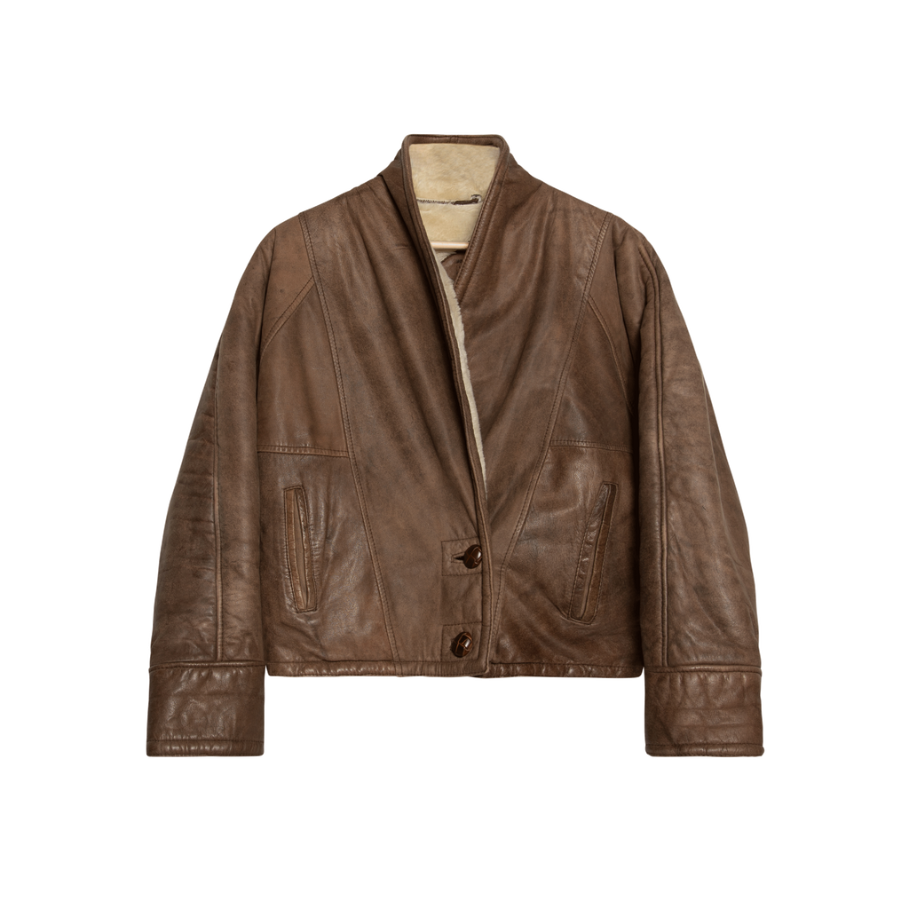 Vintage Leather and Shearling Lined Jacket features button closures and shawl lapel.