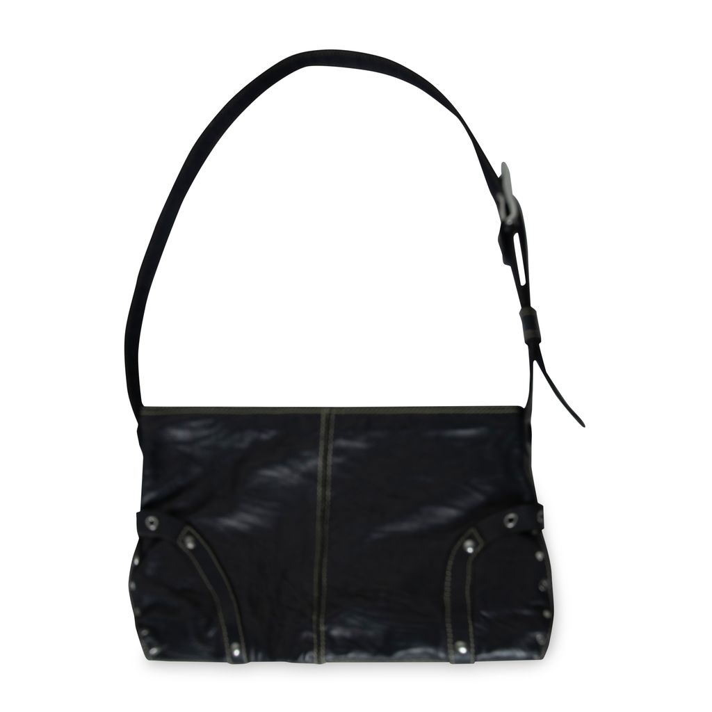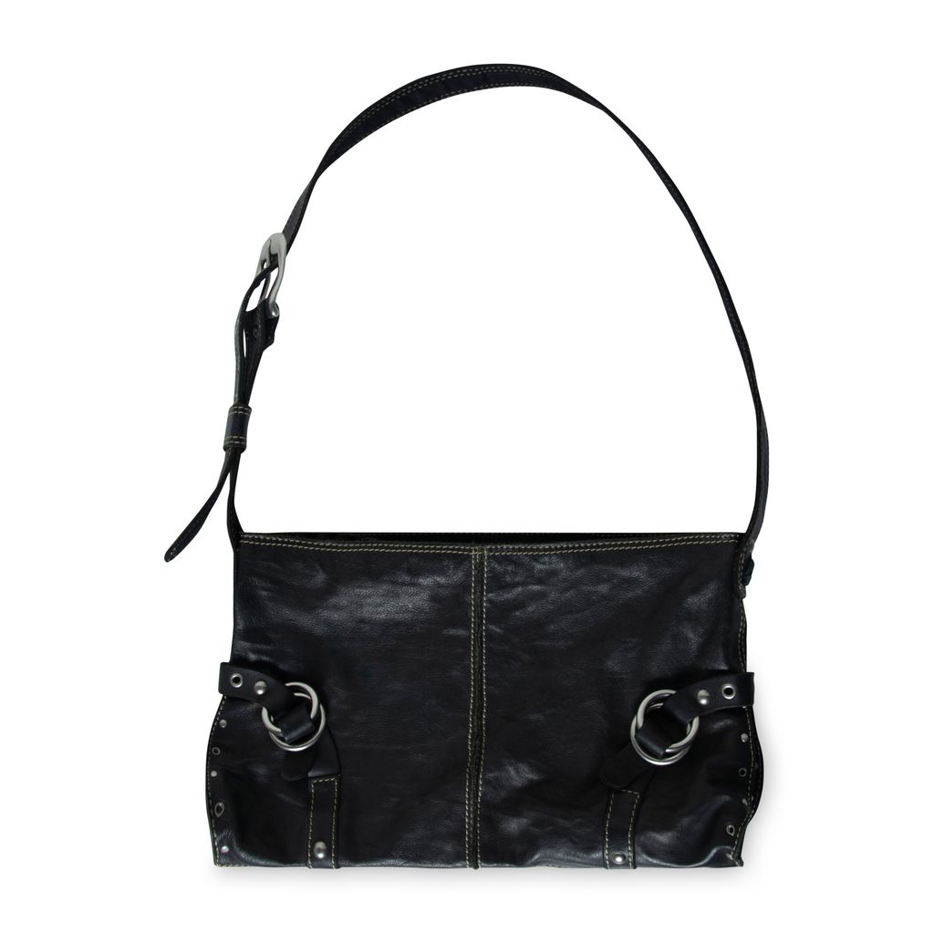 Vintage leather buckle crossbody bag features buckles and silver tone hardware throughout, contrast stitching, adjustable shoulder strap, single zip pocket at interior, and zipper closure at top.