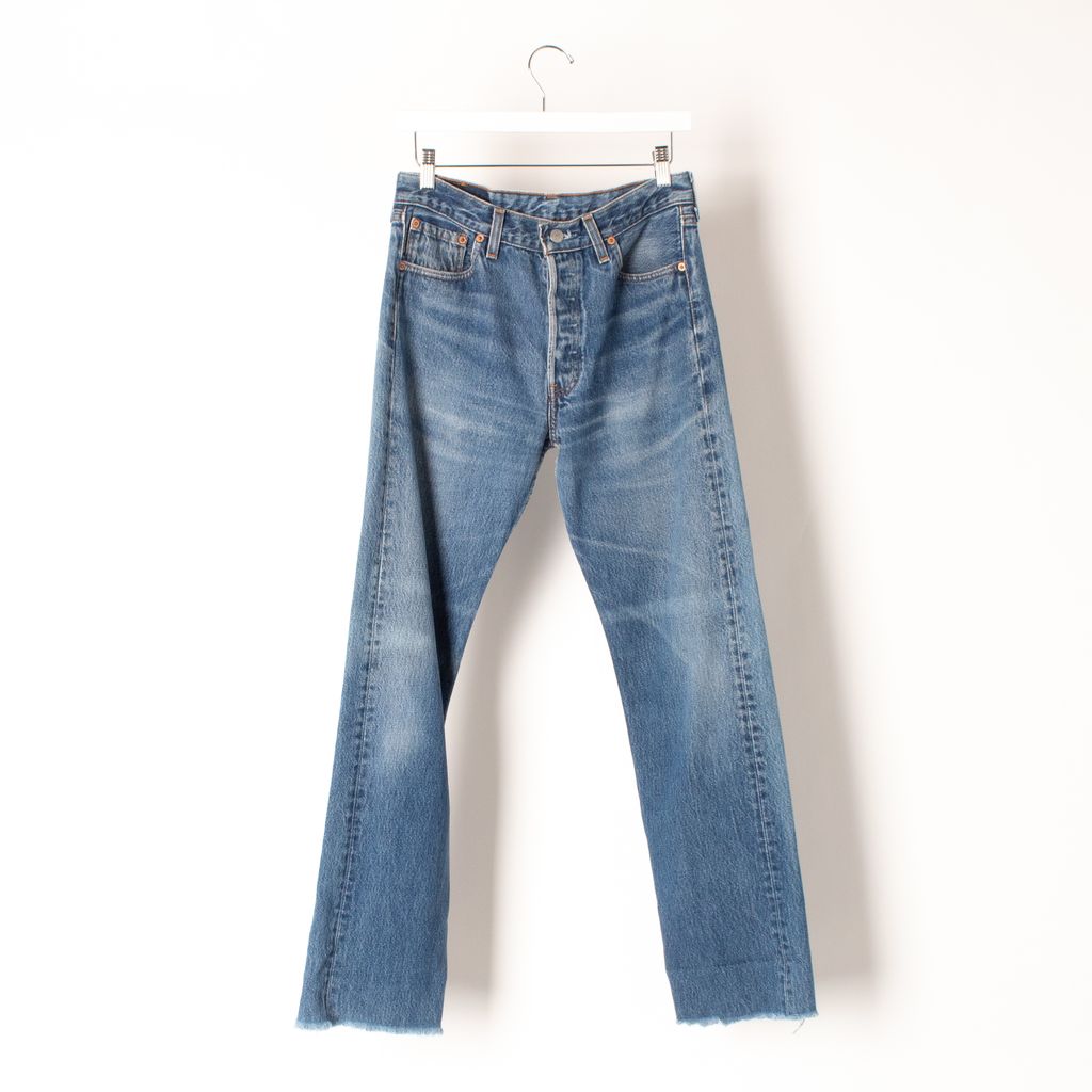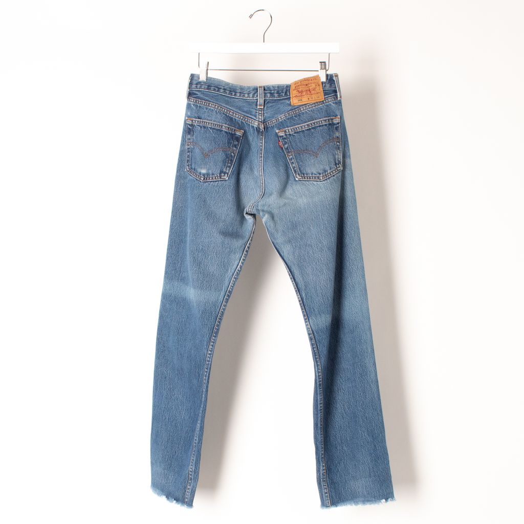 Vintage Levi's 501 style jean. Original relaxed fit featuring age and wear over time akin to a vintage piece. Classic five pocket style with a button fly finish and custom tapered leg. In a medium wash.