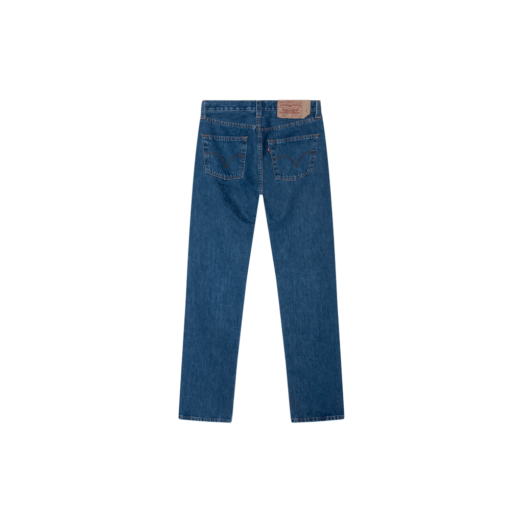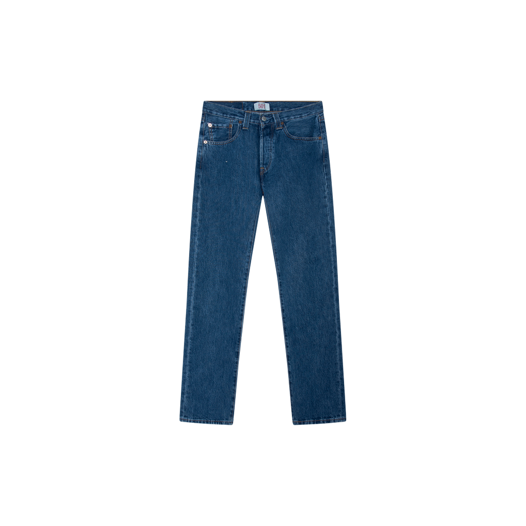 Vintage Levi's Blue 501 features front button closure, 5 pocket styling, and straight leg.