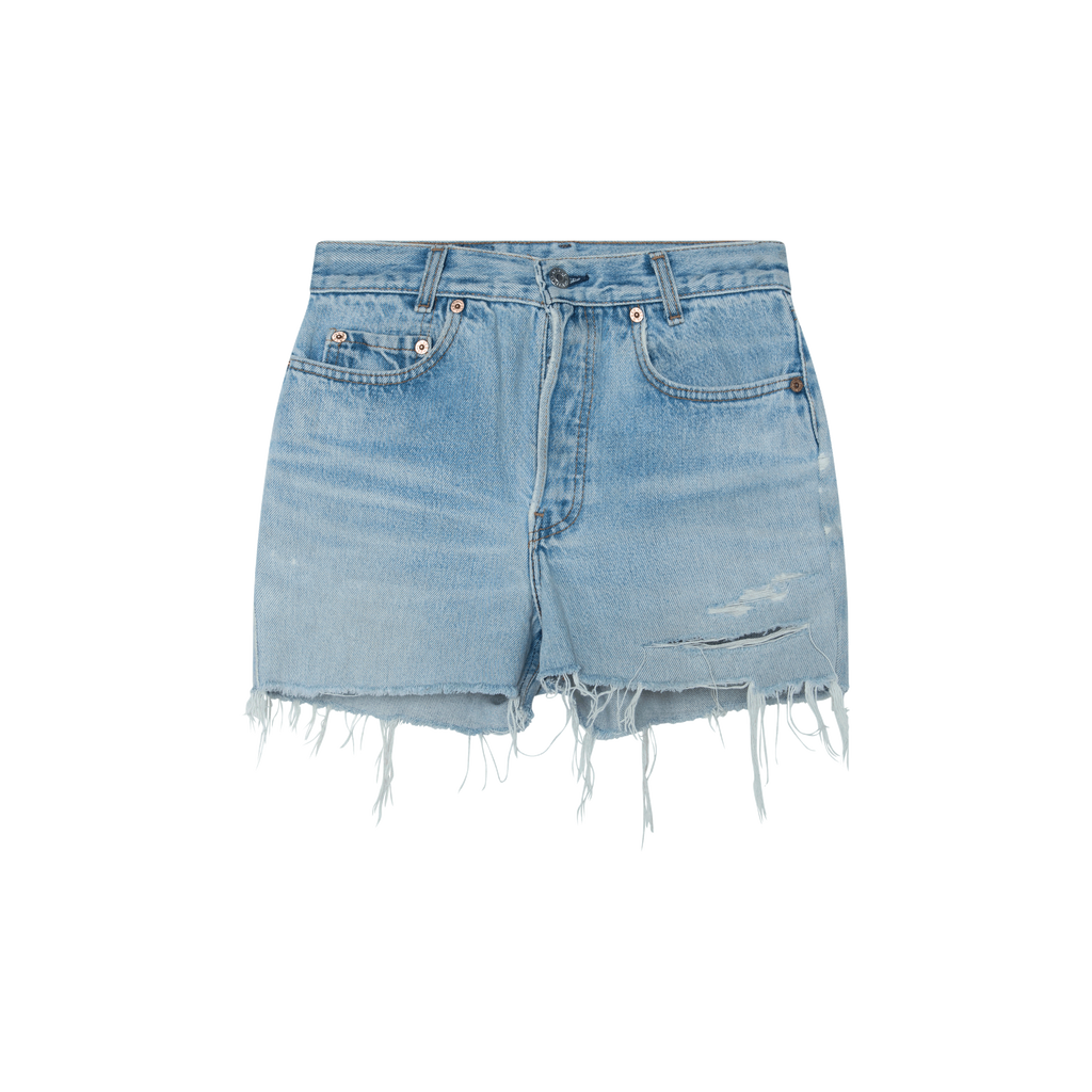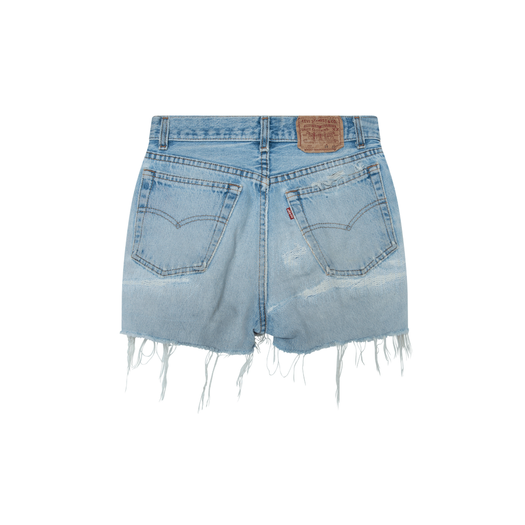 Vintage Levi's Cut Off Shorts feature front button closure, frayed hem, and distress detail.