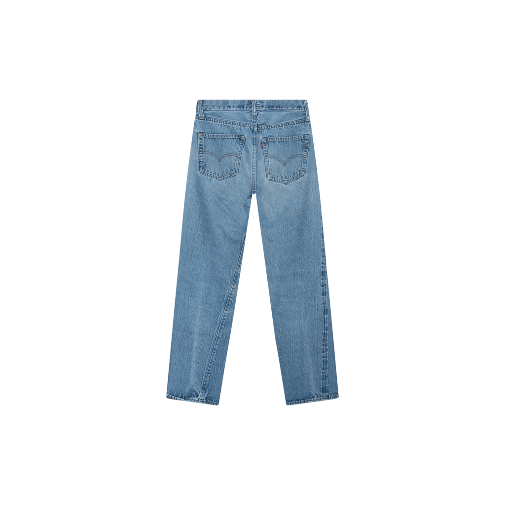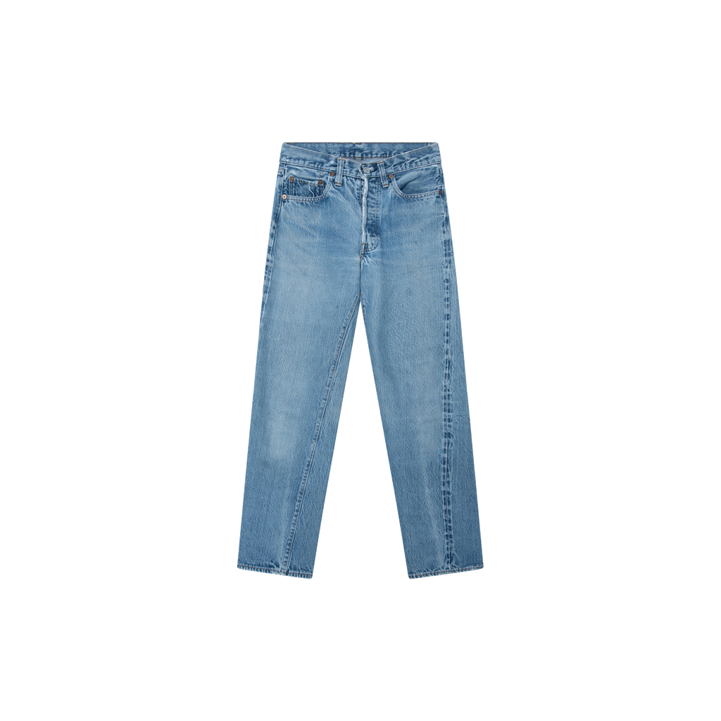 Vintage Levi's Light Wash 501 features front button closure, straight leg, and 5 pocket styling.