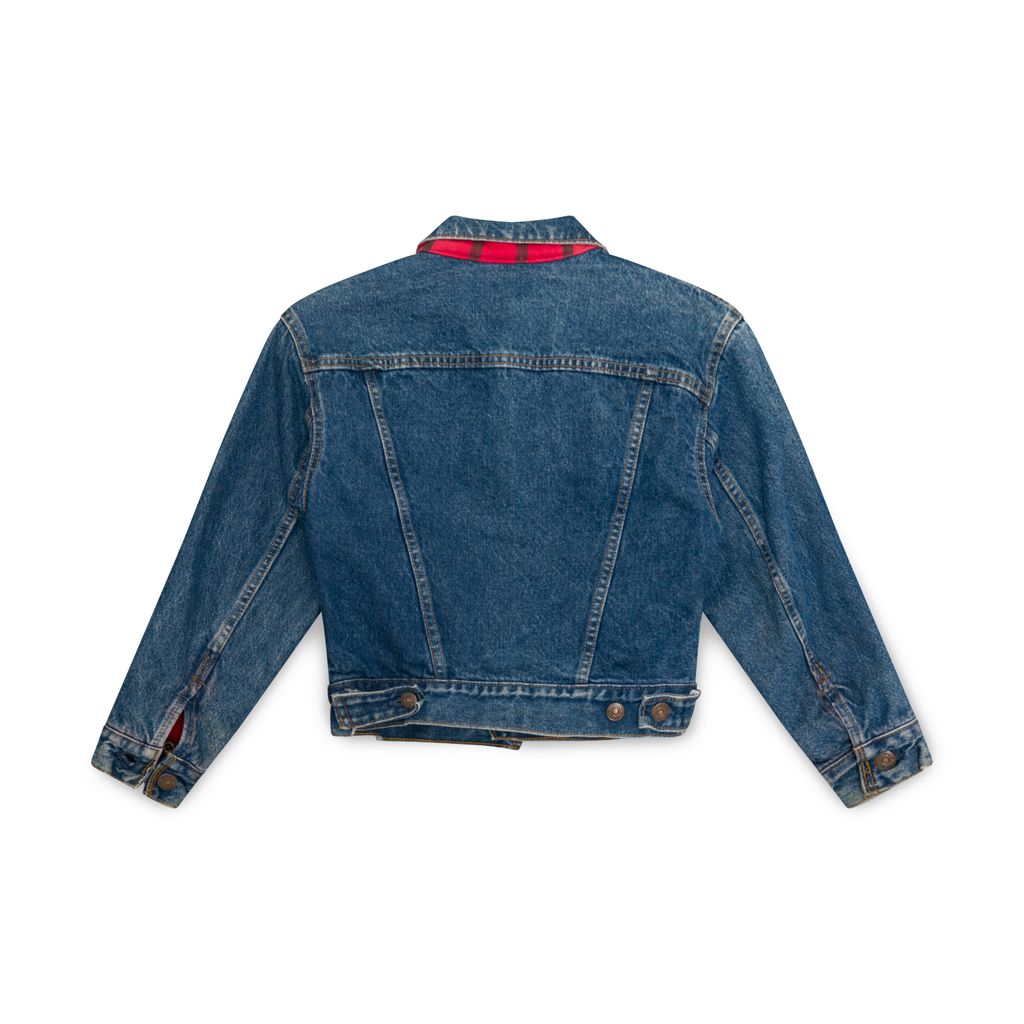 Vintage Levi's Plaid-Lined Denim Jacket features button up closure, adjustable cuffs, two chest pockets and two side pockets, red plaid lining on inside.