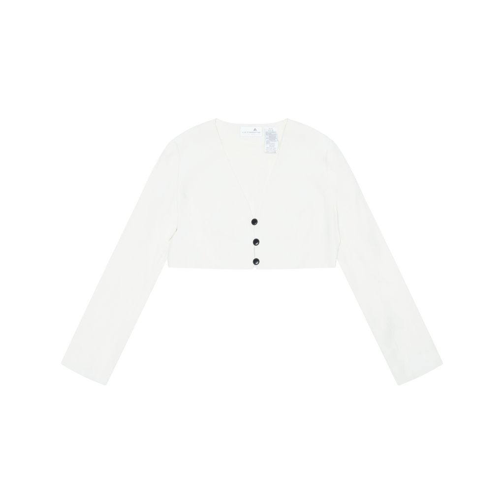 Vintage Liz Claiborne White Cropped Jacket features front button closure, V-neck, and cropped fit.