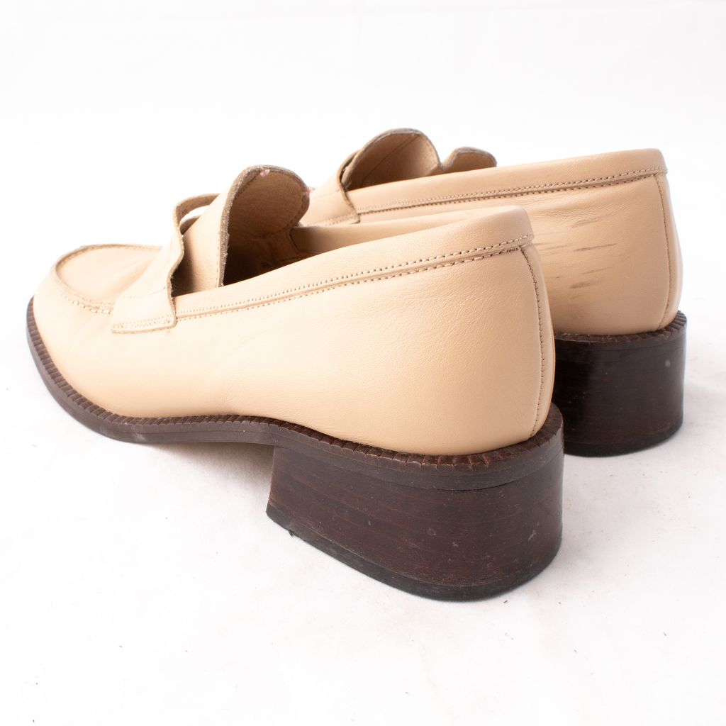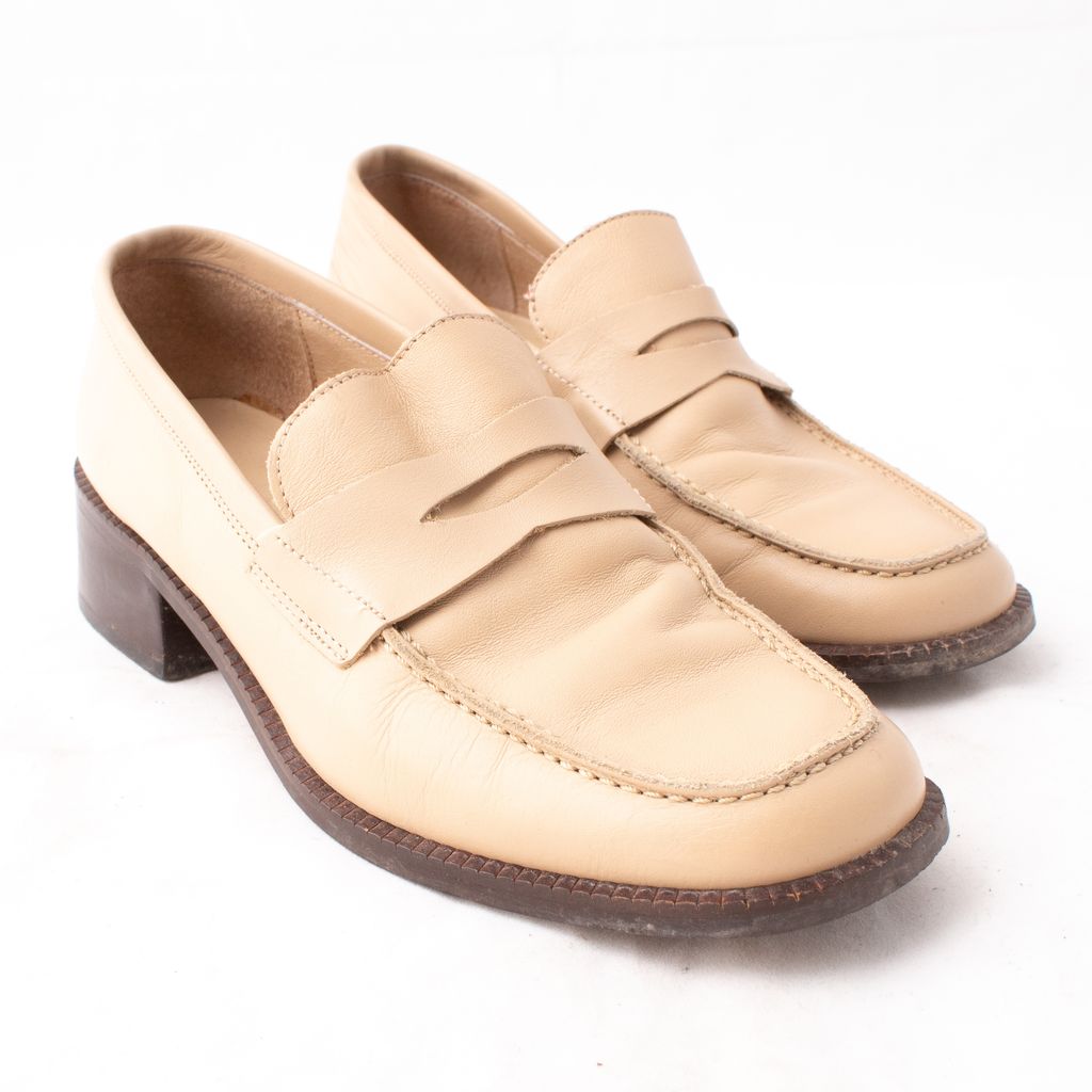 In fair condition, vintage heeled loafer. Made in Spain featuring a moc toe finish, penny keep strap, a sturdy heel and sole.