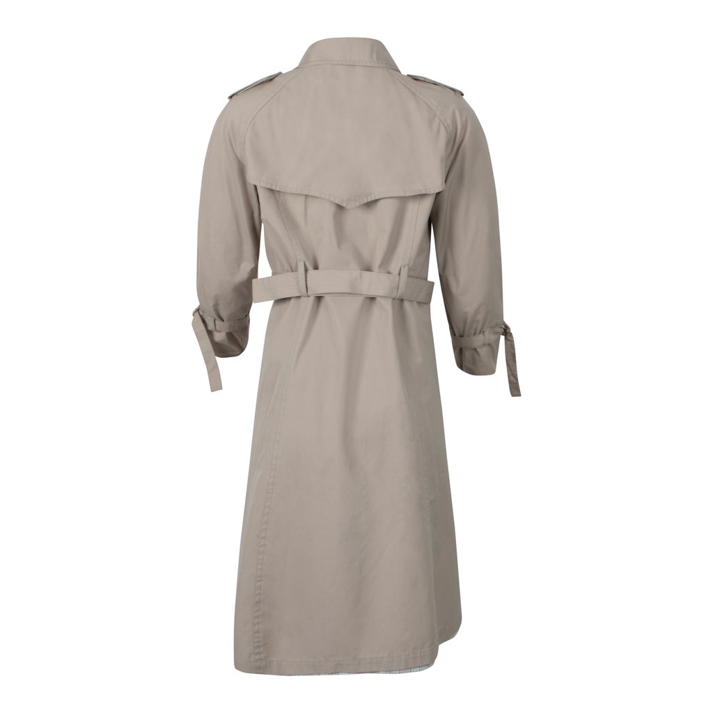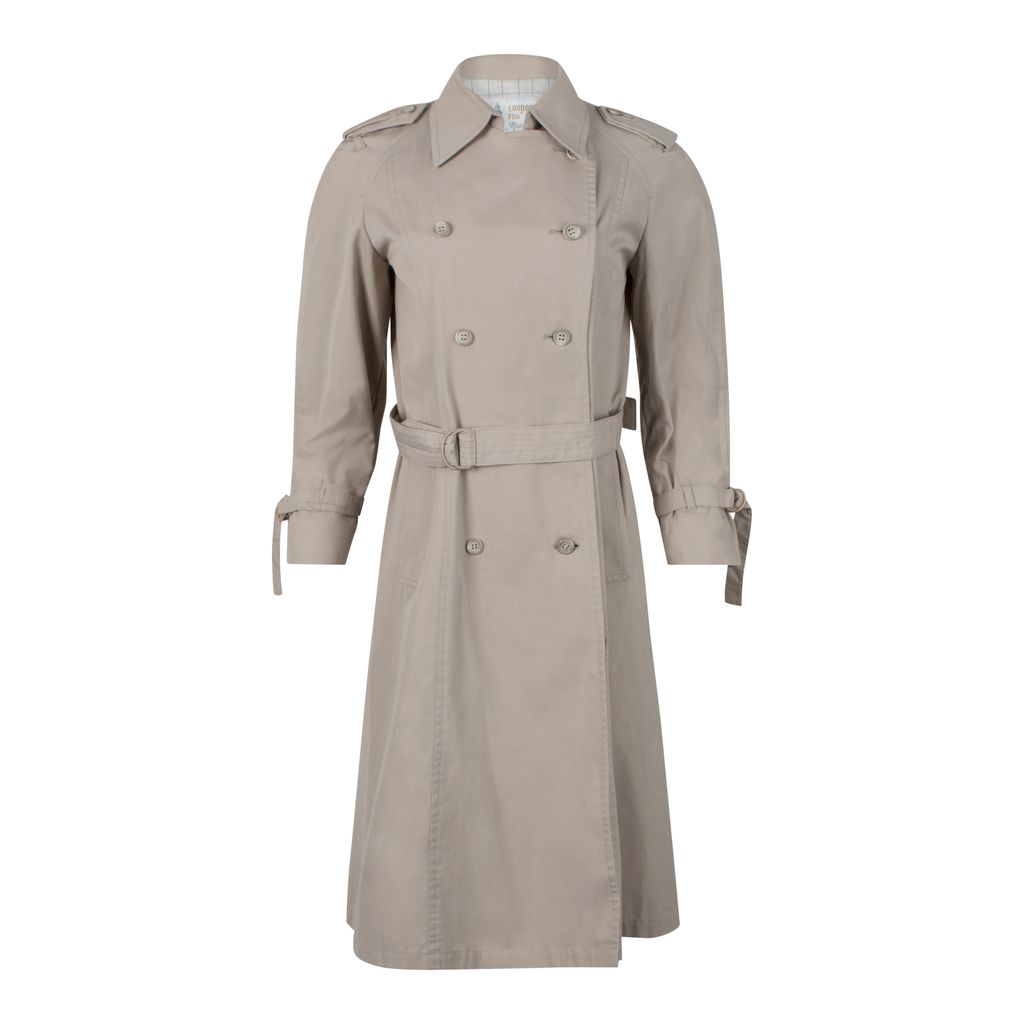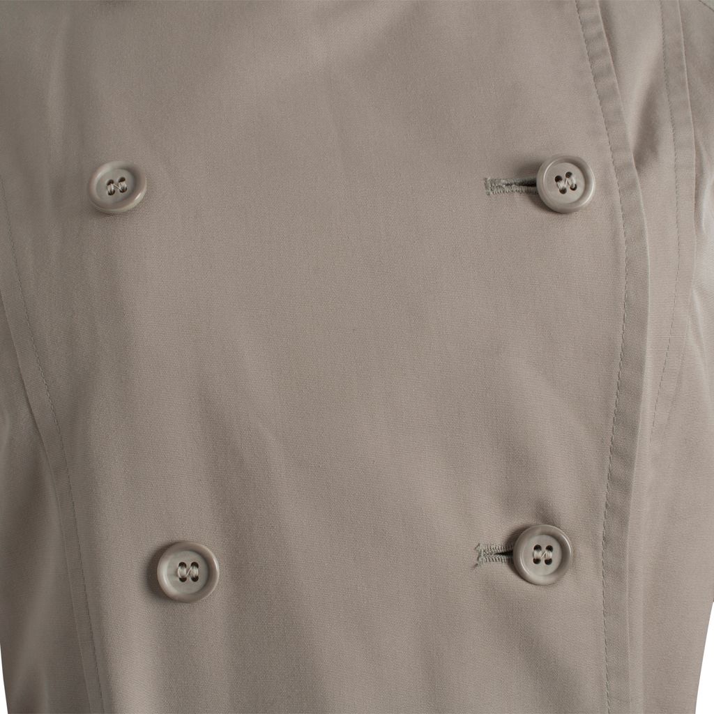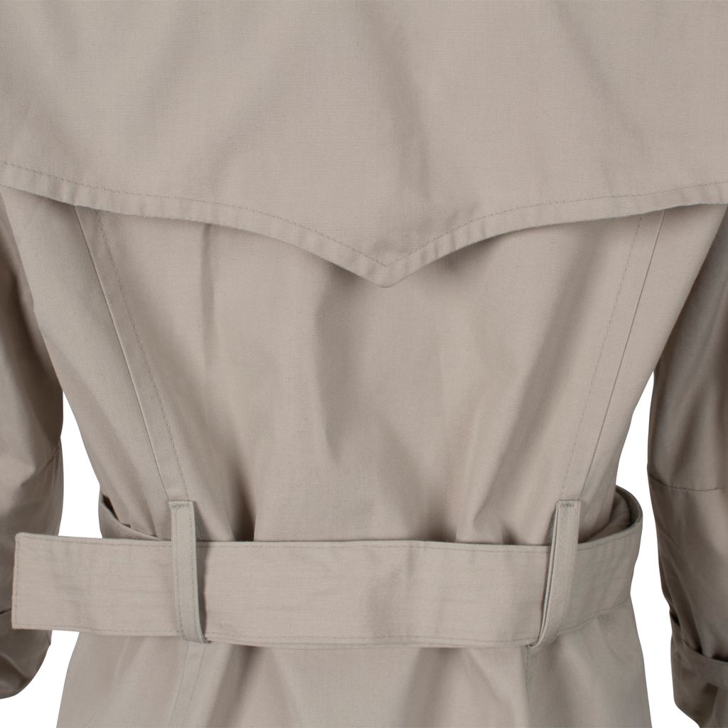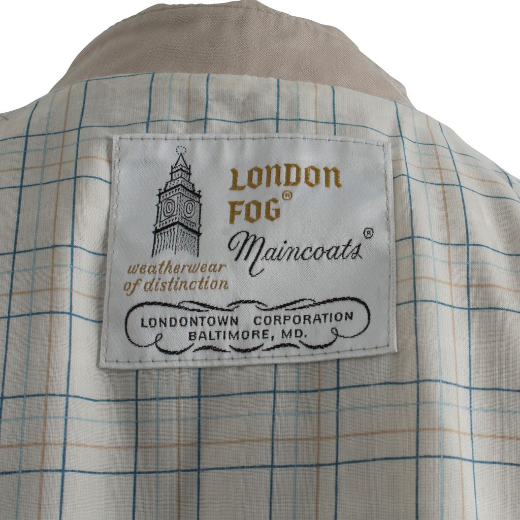 This trench coat from London Fog has a point collar neckline, a double breasted button-down closure, functional side pockets, and long sleeves with adjustable cuffs. This coat also has an adjustable waist belt and storm flap feature at the back. Comes with inner plaid lining. Gently worn marks as pictured.
