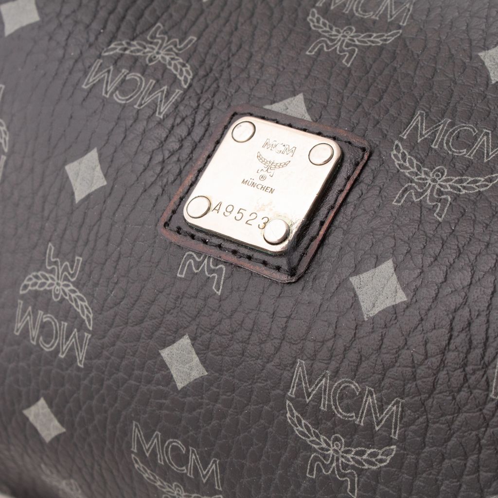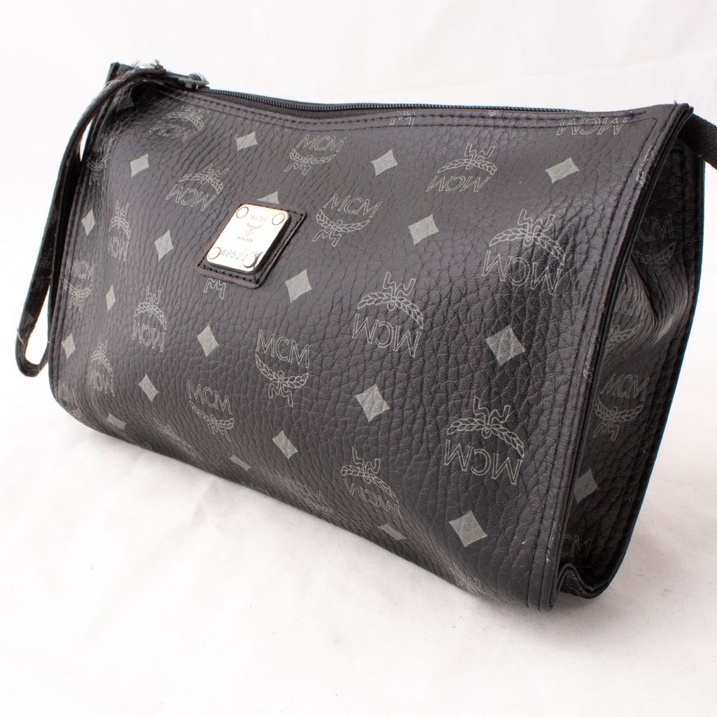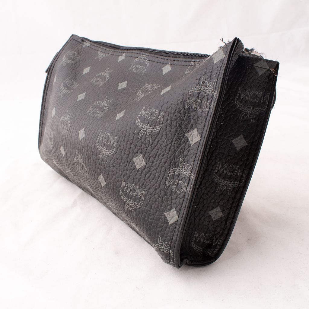 Vintage MCM clutch bag featuring allover print. Zip seal, front metal logo appliqué detail, leather. Some wear to zipper and zip seal. Measures 10" in length and is 7.5" tall.
