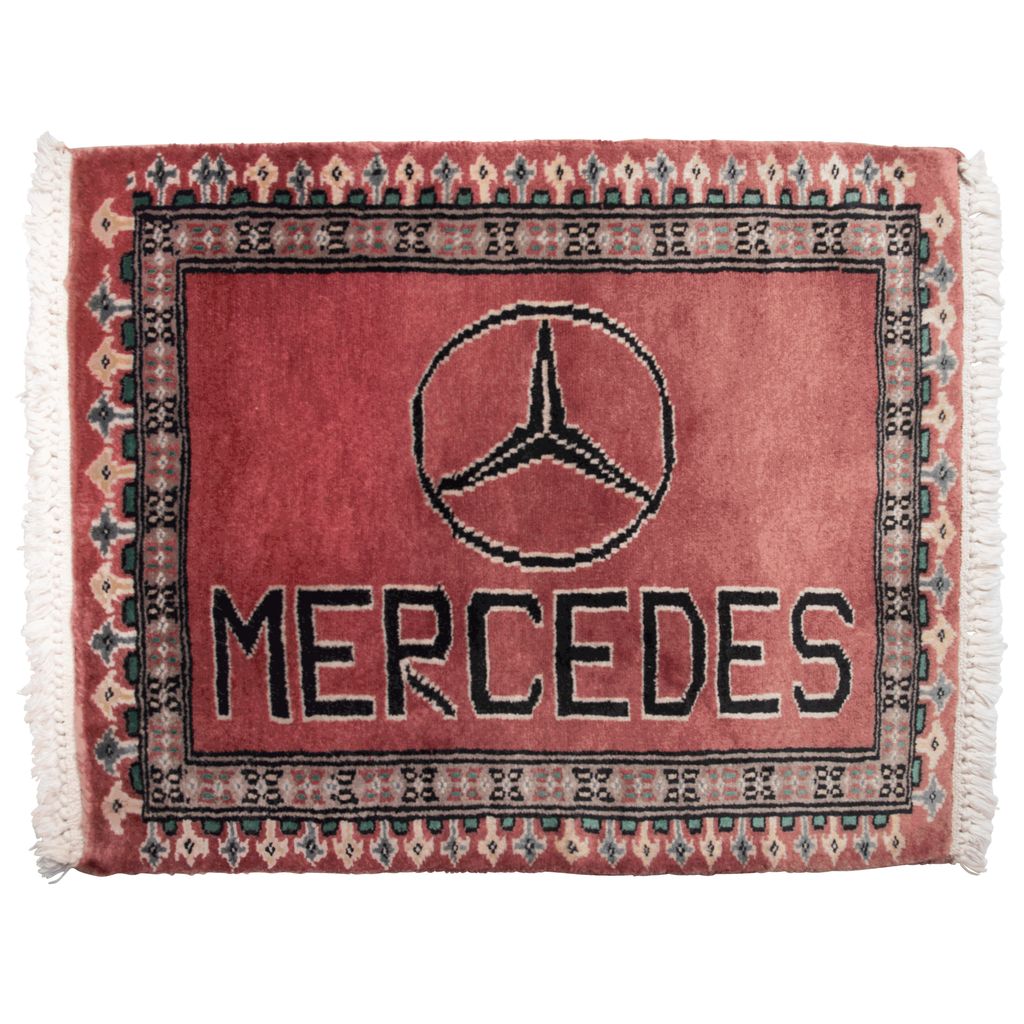 Vintage Mercedes Afghan Rug features the Mercedes logo in black.
