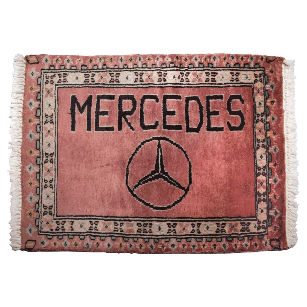 Vintage Mercedes Afghan Rug features Mercedes logo in black.