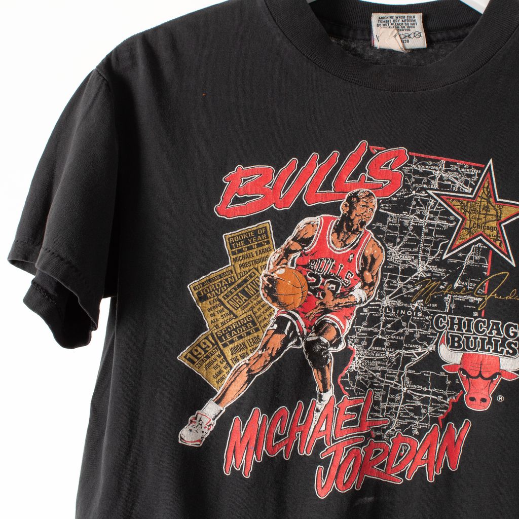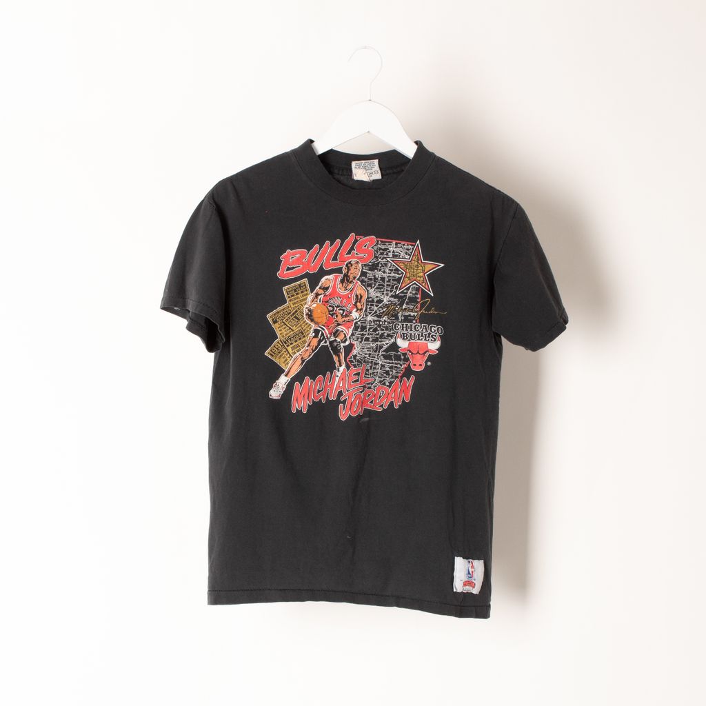 In great vintage condition, Michael Jordan Bulls tee. Features a screen printed front graphic with natural wear and aging akin to a vintage piece. Sized a youth large.