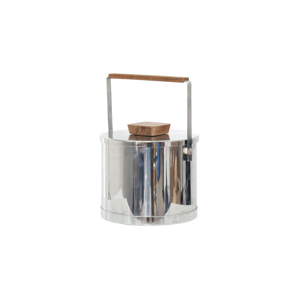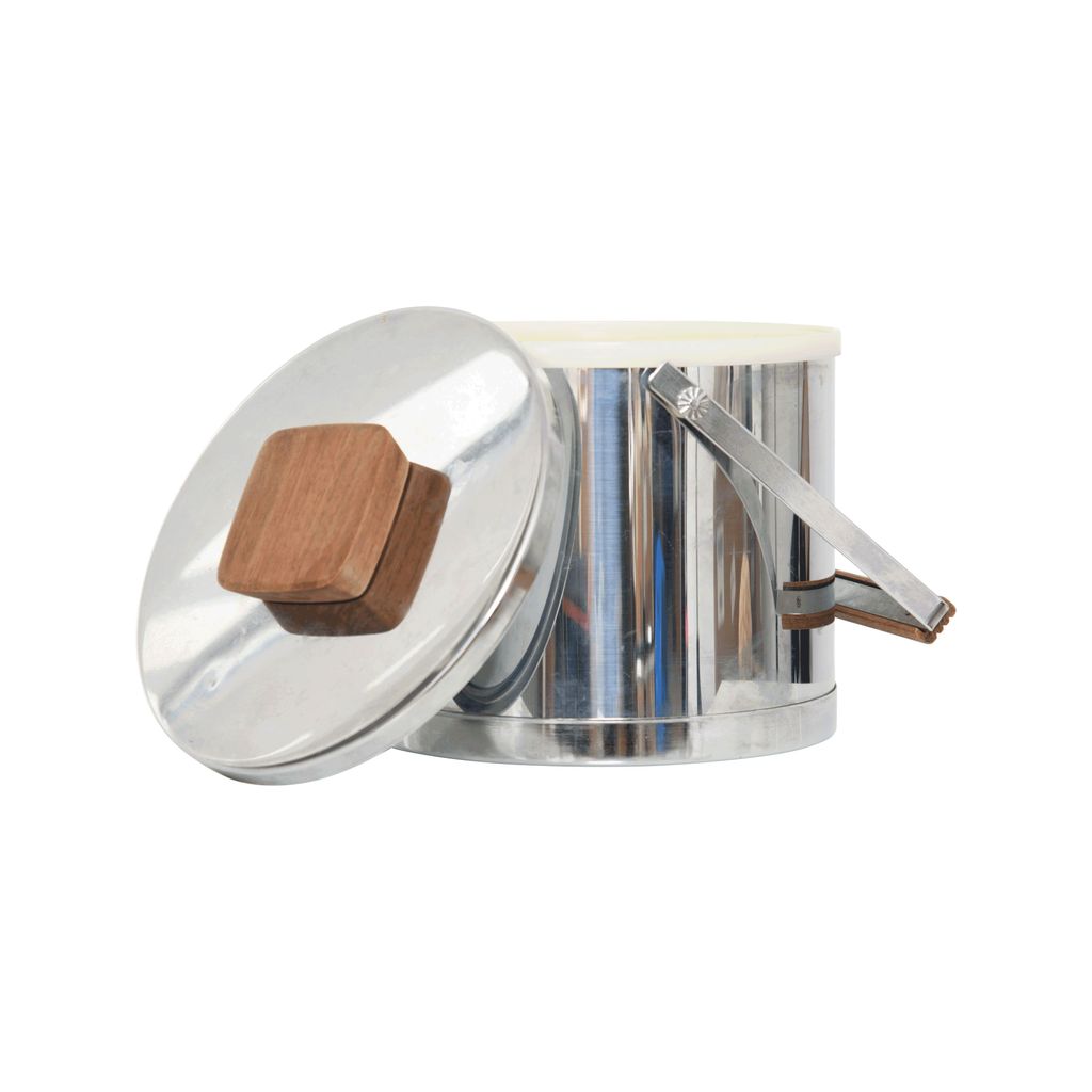 Vintage Mid-Century Atapco Stainless Steel Ice Bucket features wooden handles and a white polished interior