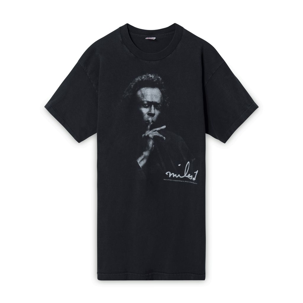 Vintage black t-shirt features a graphic of Miles Davis and his signature.