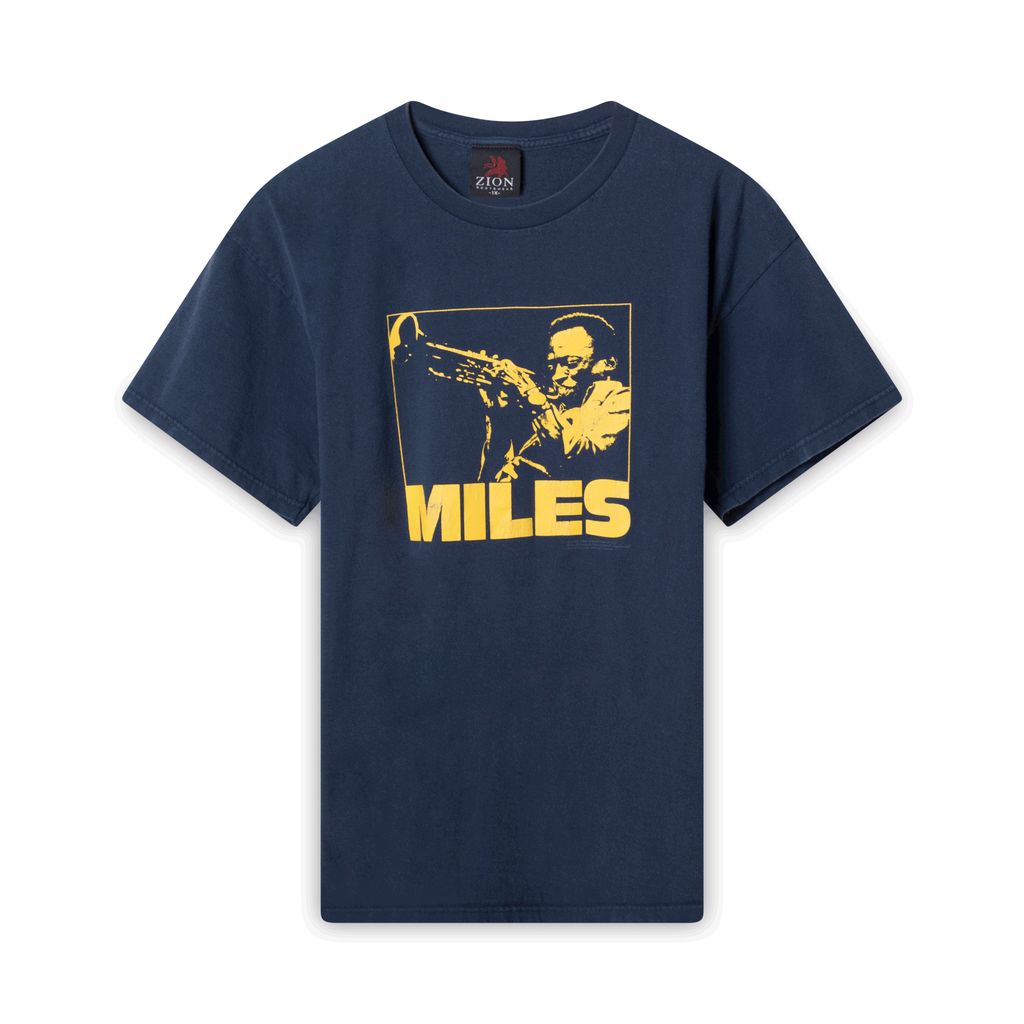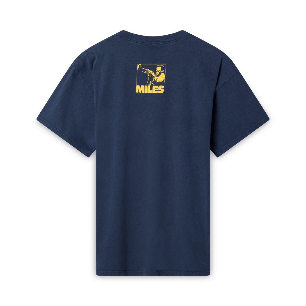 Vintage Royal Blue tee features a classic Miles' Davis graphic and text in yellow.