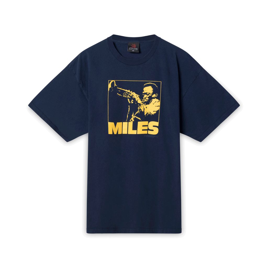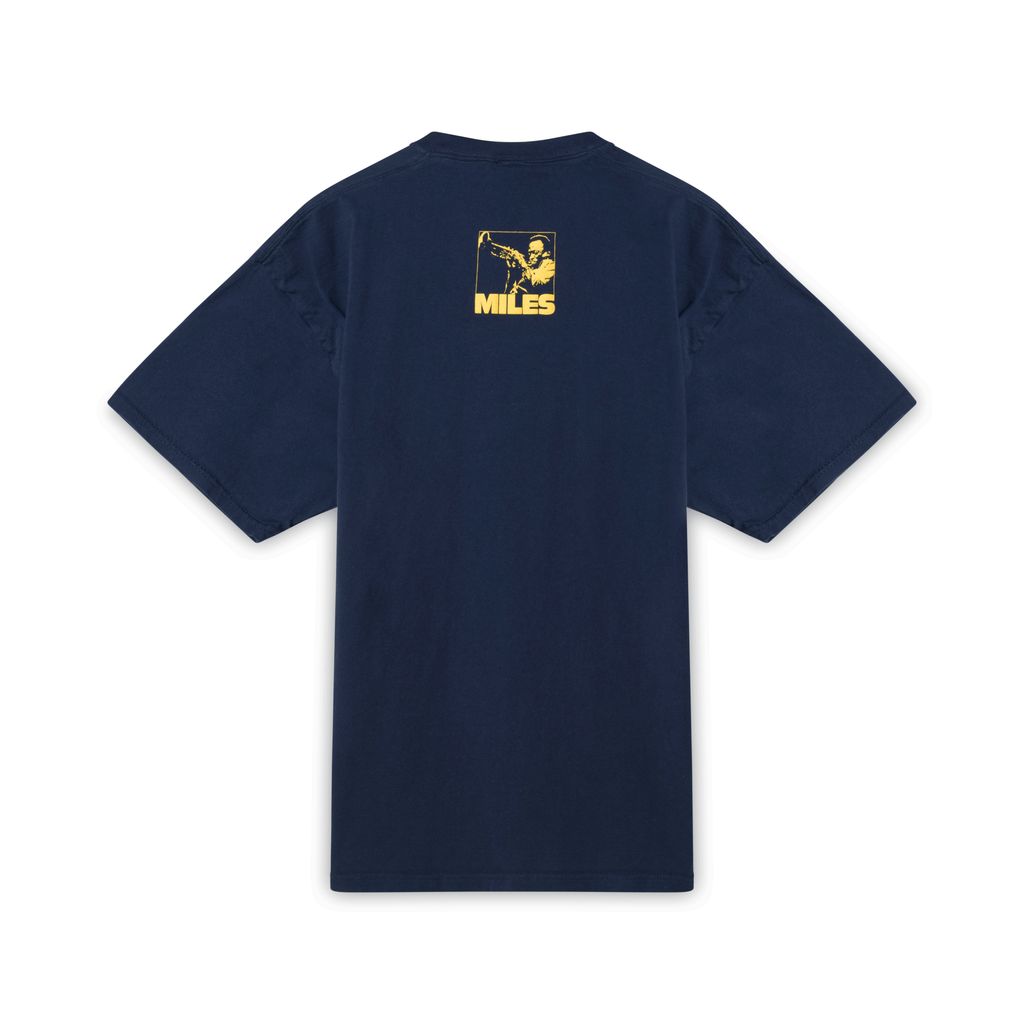 Vintage Royal Blue tee features a classic Miles' Davis graphic and text in yellow.