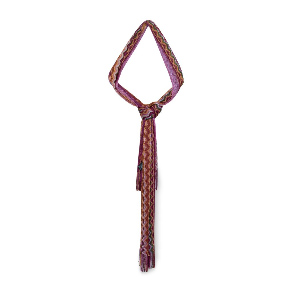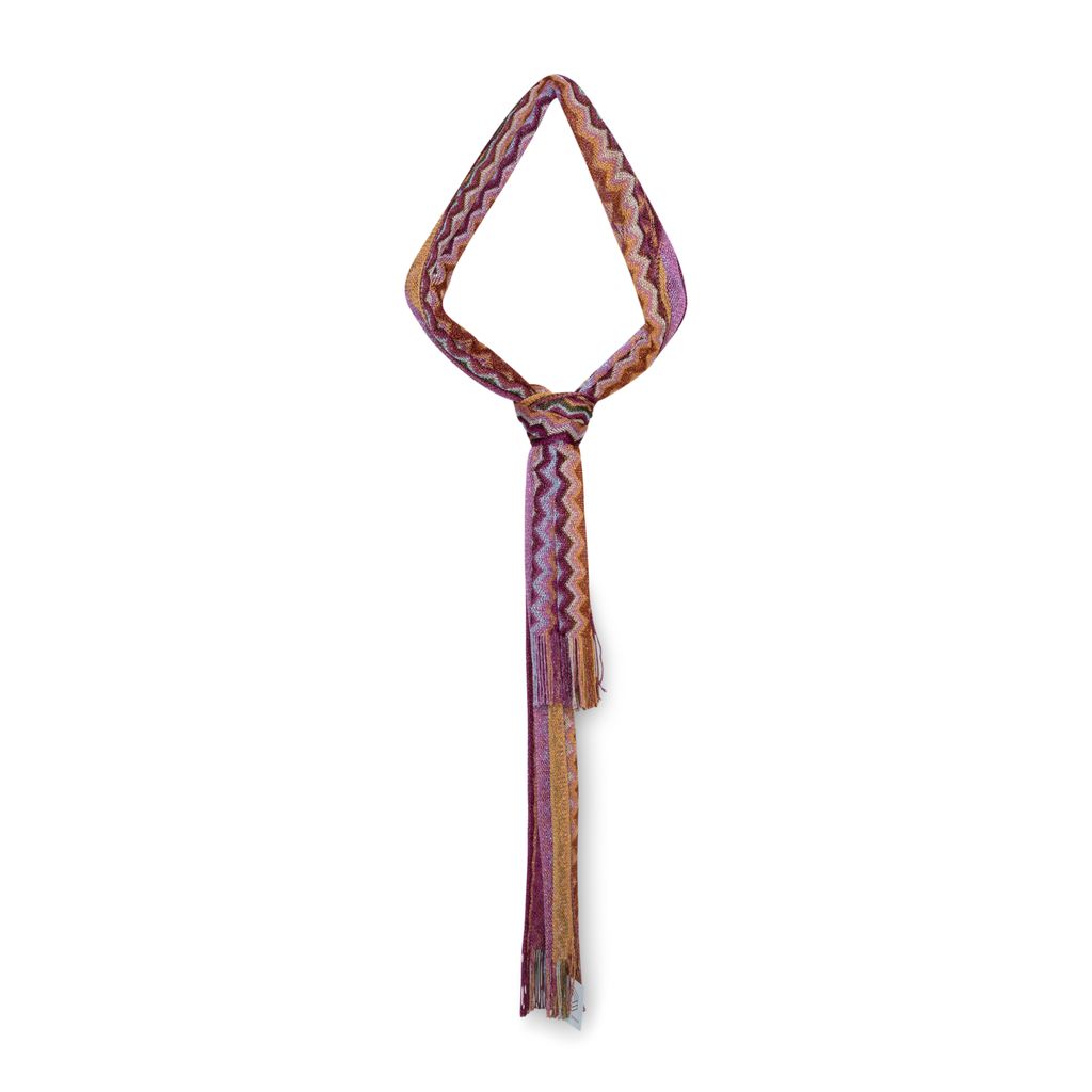 Vintage Missoni Orange and Purple Skinny Scarf features chevron print and tassels at ends.
