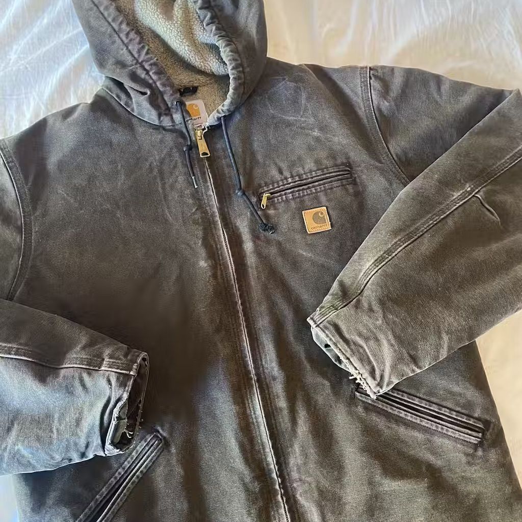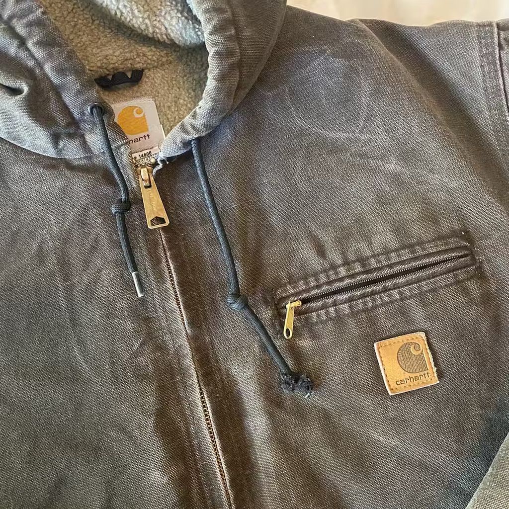 Vintage Mocha Carhartt Hooded Jacket features front zip closure, zippered chest pocket, 2 side pockets, drawstrings at hood, and ribbed cuffs.