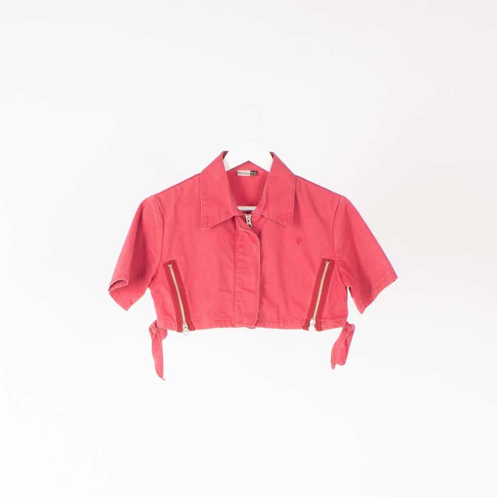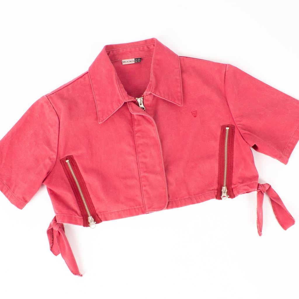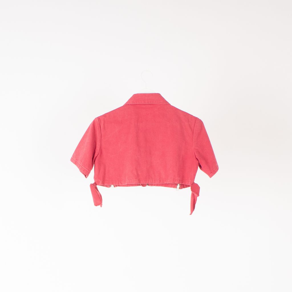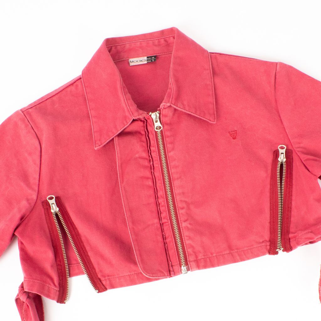 Crop it like it's hot in this chopped up workwear shirt from Mooks. Features hyper cropped body, zipper font closure, angled front vent zippers, side ties, and large collar shape.