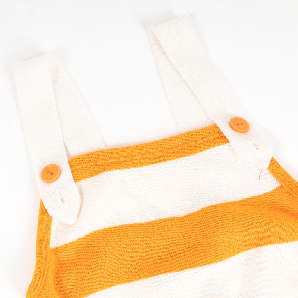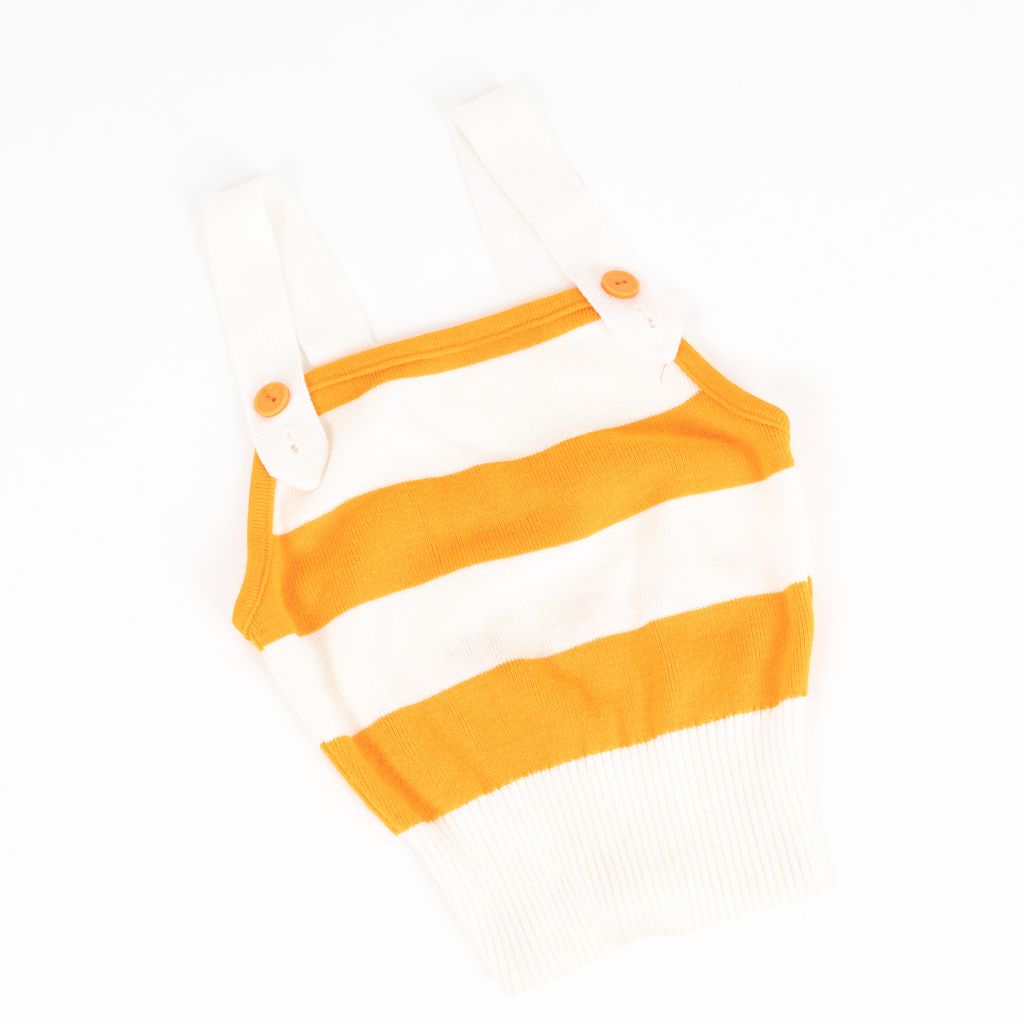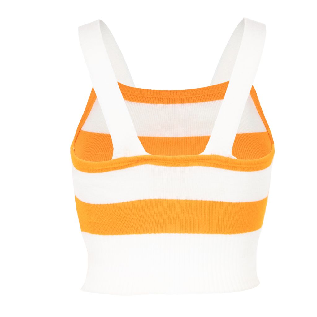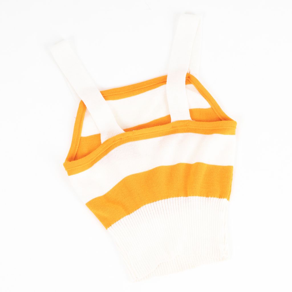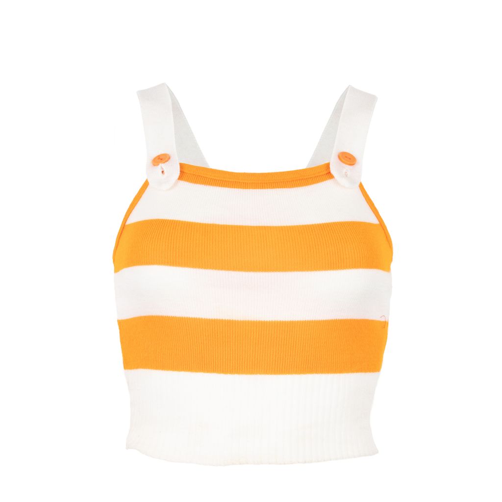 What's orange and white and cute all over? You, wearing this charming top from label vintage label Name Droppers! Features adjustable button closure straps, ribbed hemline, formfitting style, and minor signs of wear. Signs of wear include wear on the button holes and dullness of whites as photographed.