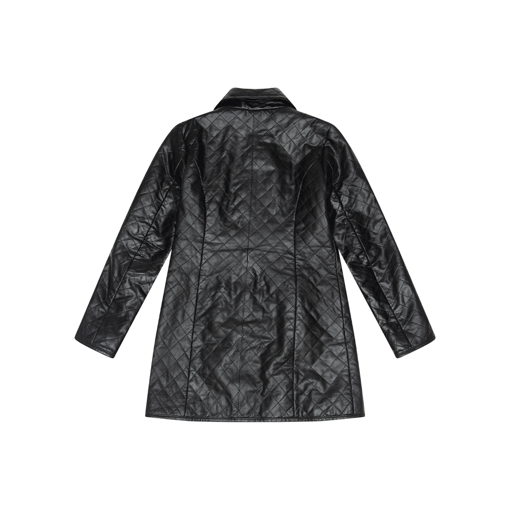 Vintage Neiman Marcus Lamb Leather Coat features front button closure, classic pointed collar, and two front pockets.