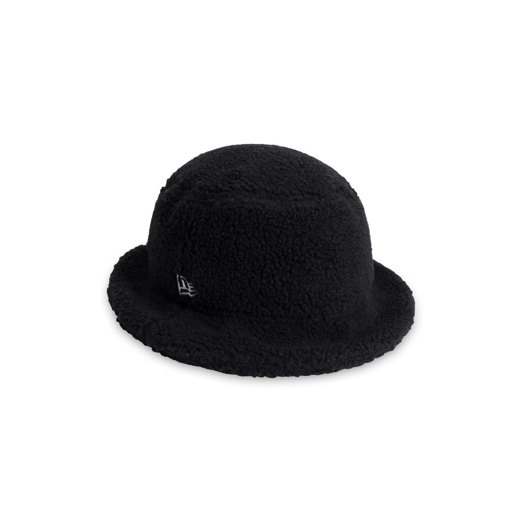 Black, shag-like bucket hat with carpet-like texture. Newera logo lines the inside of the hat.