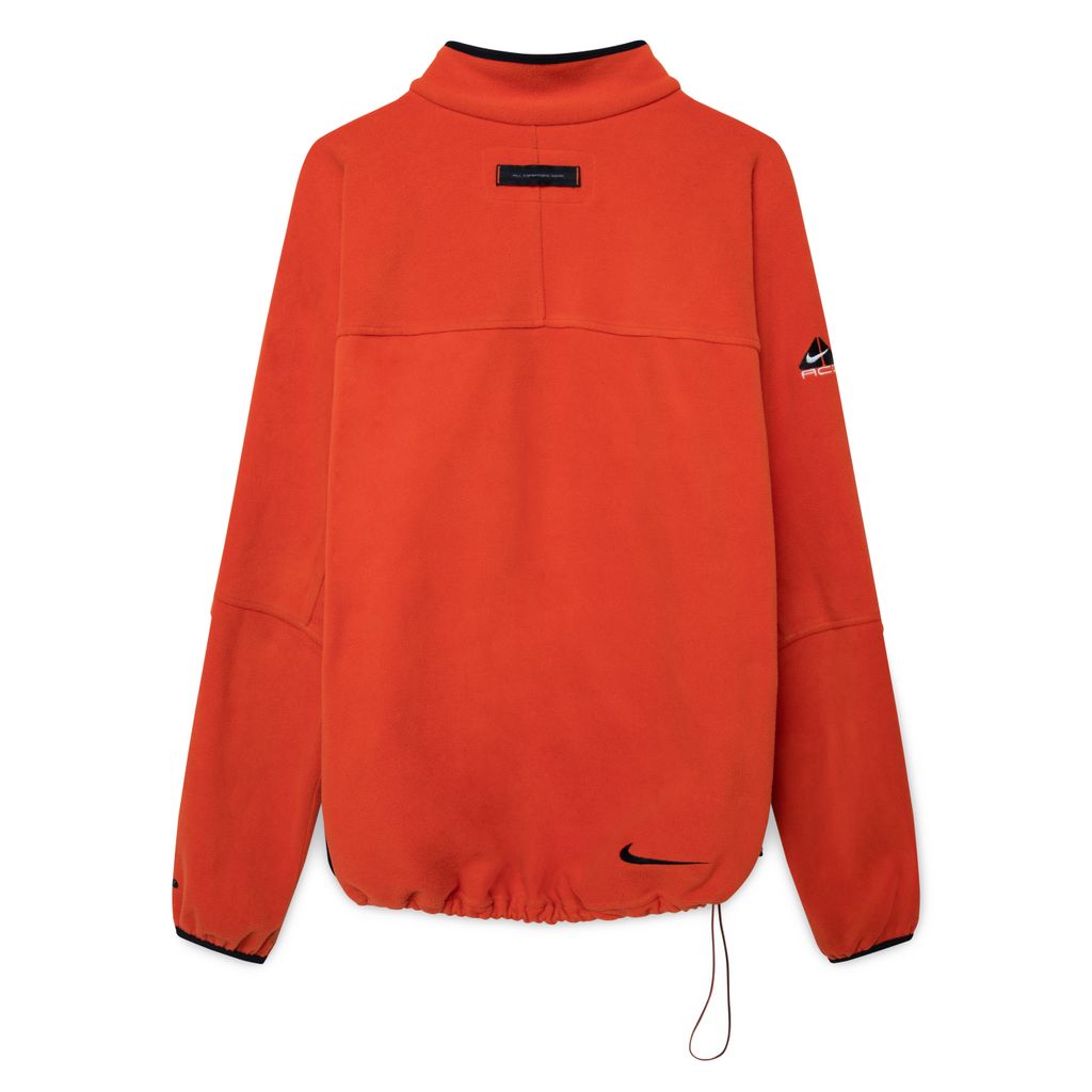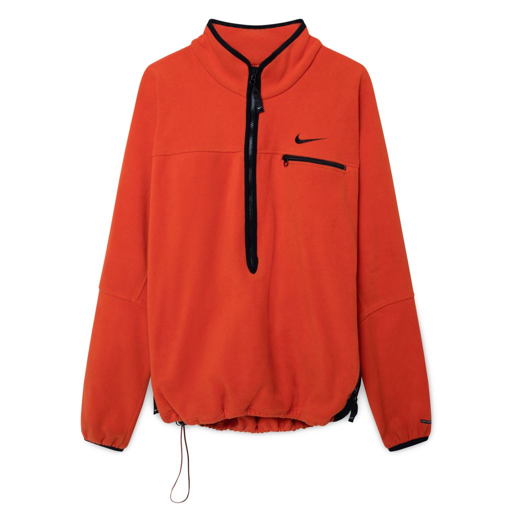 Vintage Nike ACG Orange Quarter Zip Fleece Sweatshirt features black side panels, drawstring waist, zipper on left chest, and logo embroidery on right sleeve and left chest.