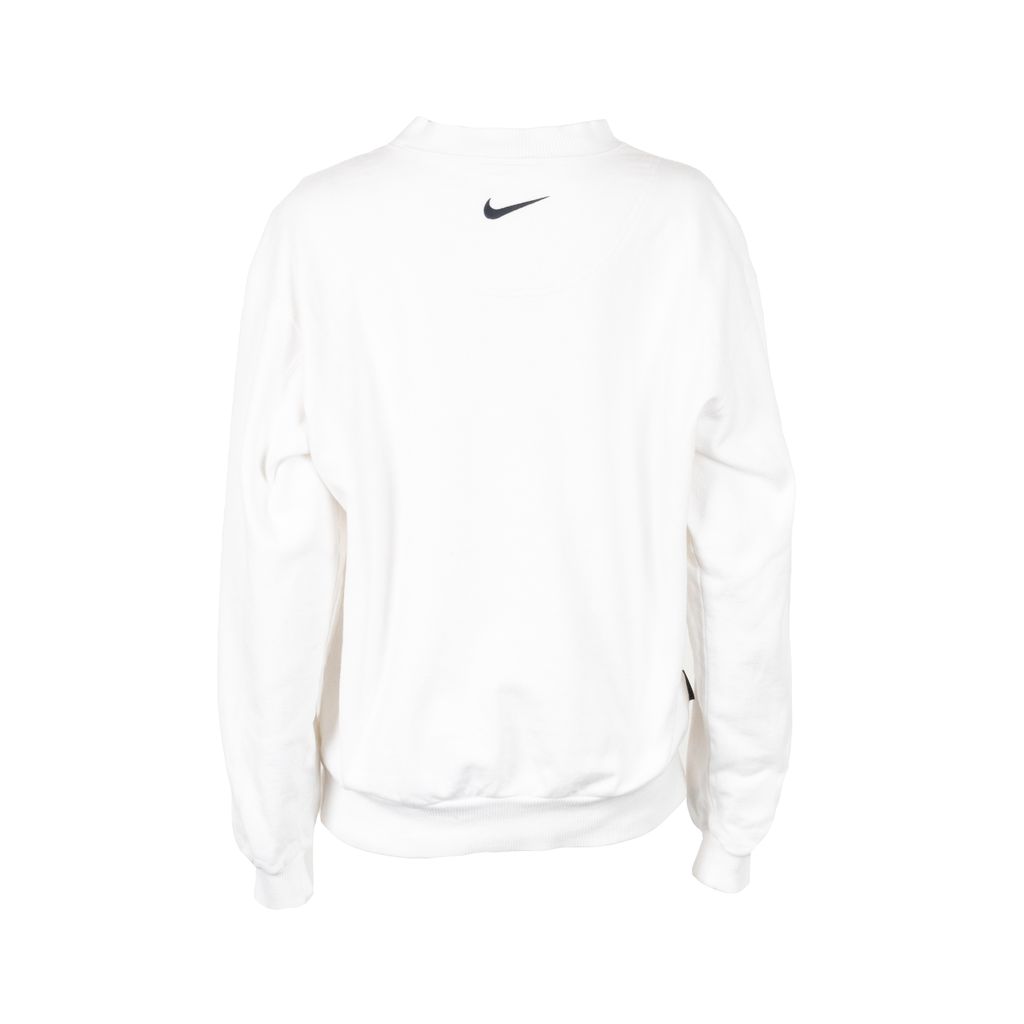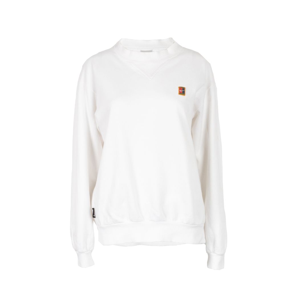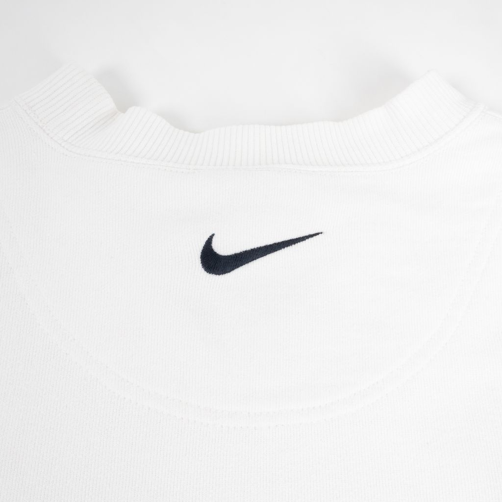 For fans of the brand and vintage heads alike, this vintage Nike pullover is a clean addition to your cold weather wardrobe. Features oversized fit, multicolor Nike swoosh logo on left side of chest, rib knit bands at neck, waist, and wrists, and minor signs of wear. Signs of wear include distressing and stretching at neck as well as staining at underarm as photographed.