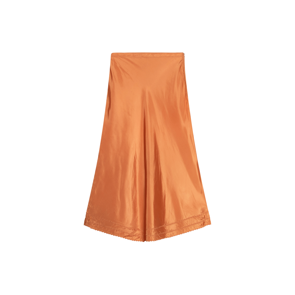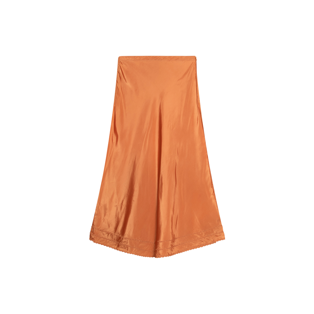 Vintage Orange Midi Skirt features side zip closure, high waist, and scalloped trim.