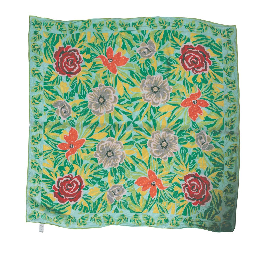 This gorgeous scarf features bright tropical flowers. Made in Japan and sourced in France.