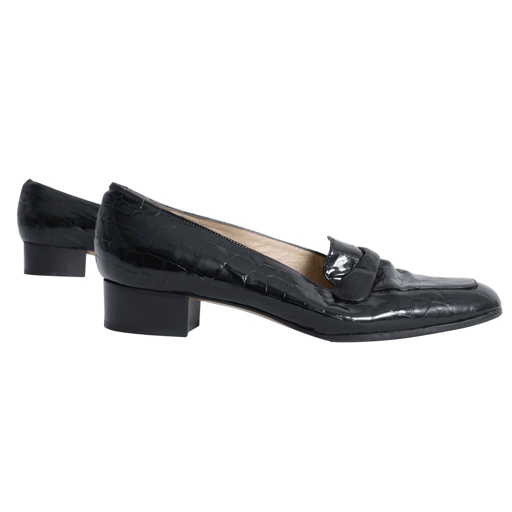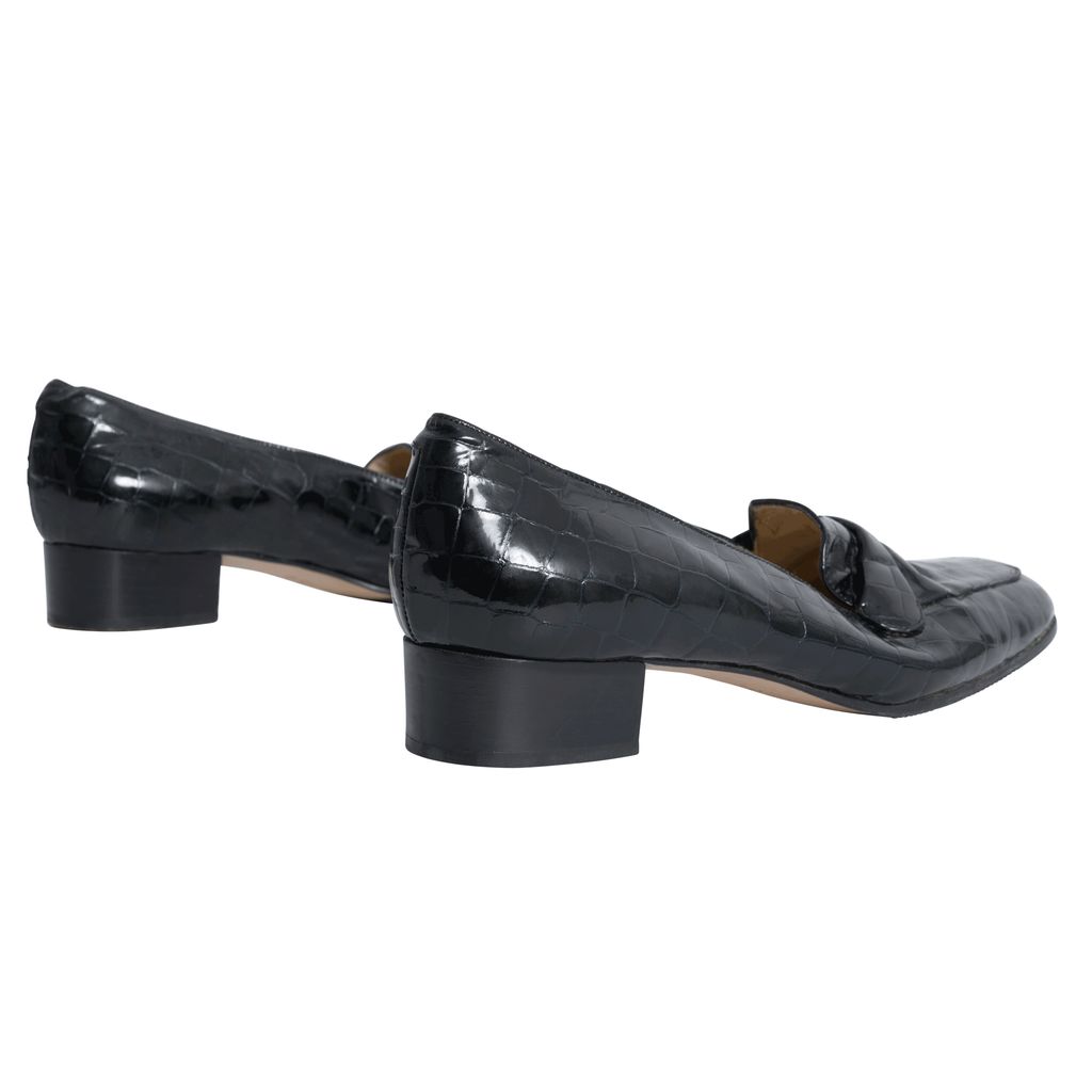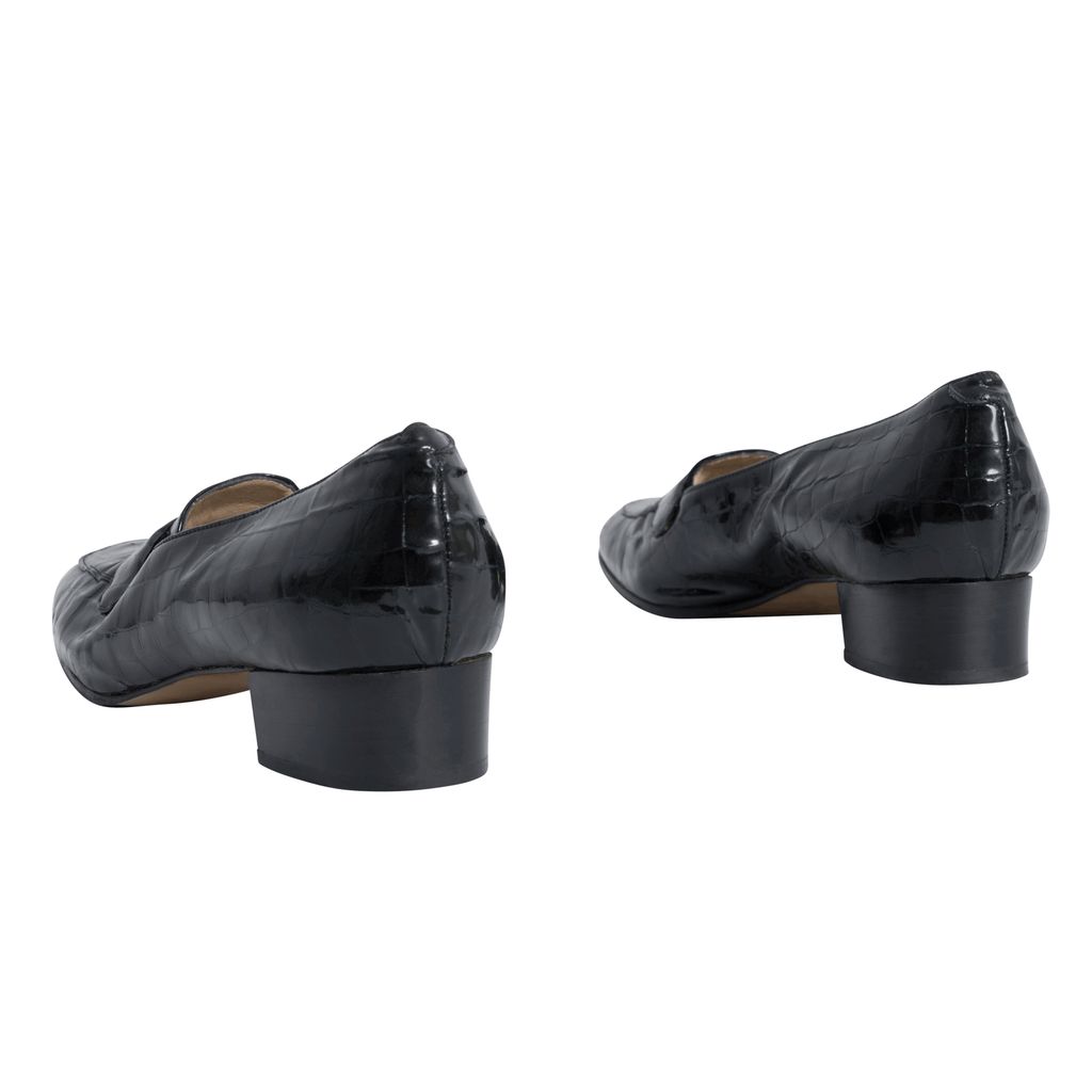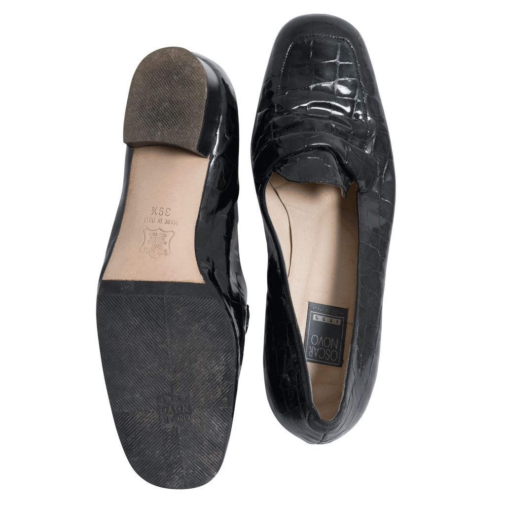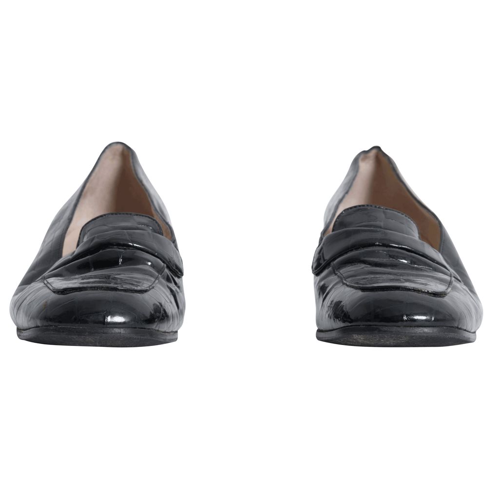 Black croc patent leather penny loafers with rubber soles.