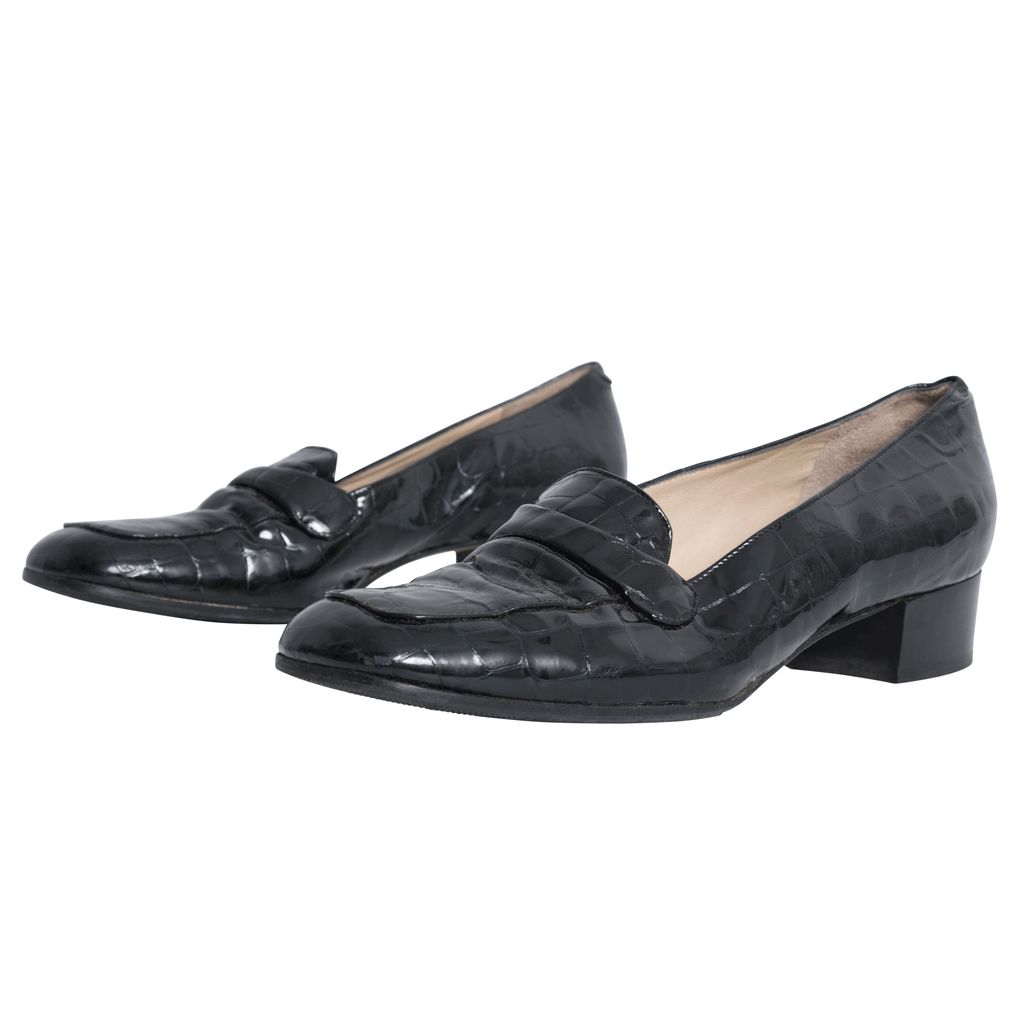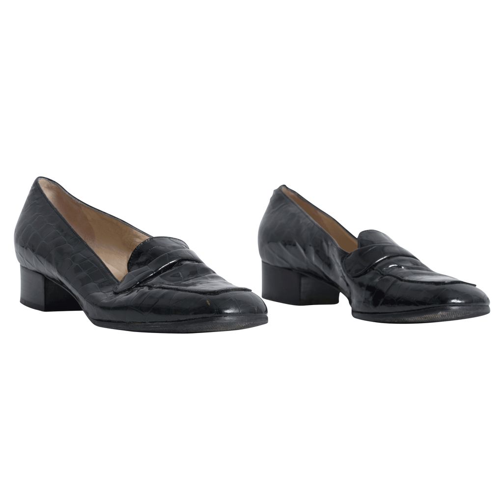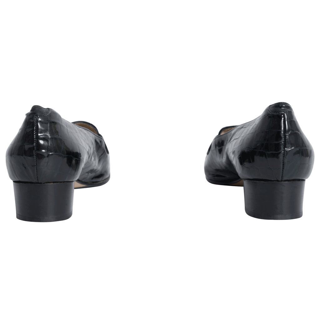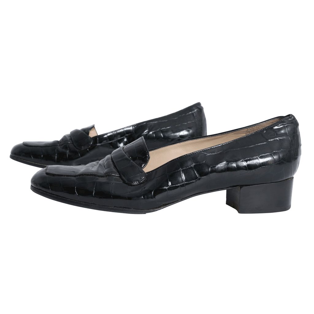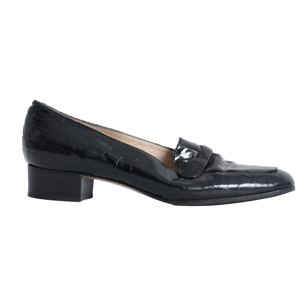 Black croc patent leather penny loafers with rubber soles.