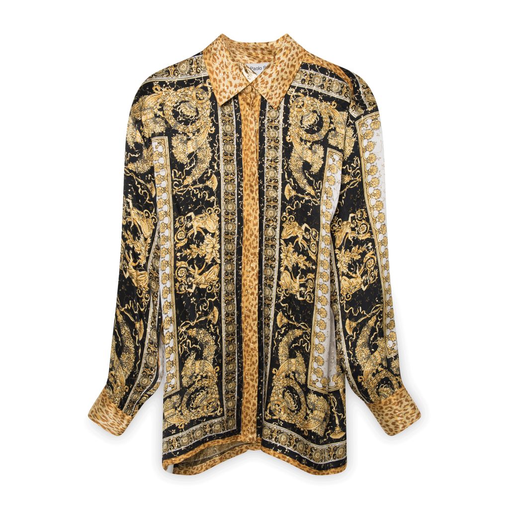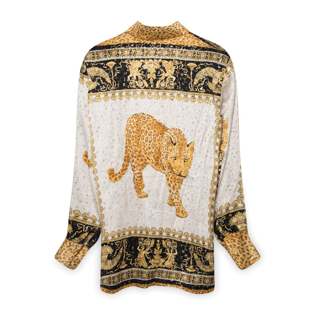 Paolo Santini silk shirt features multi-patterned gold, white, and black designs with a cheetah on the backside.