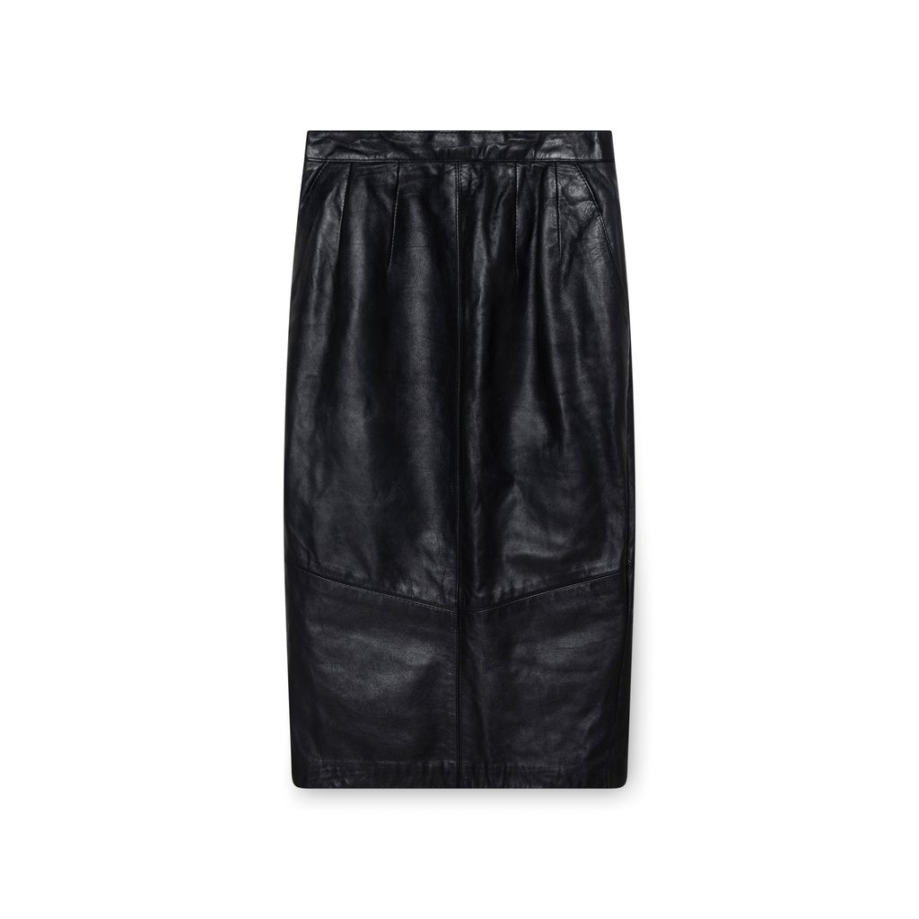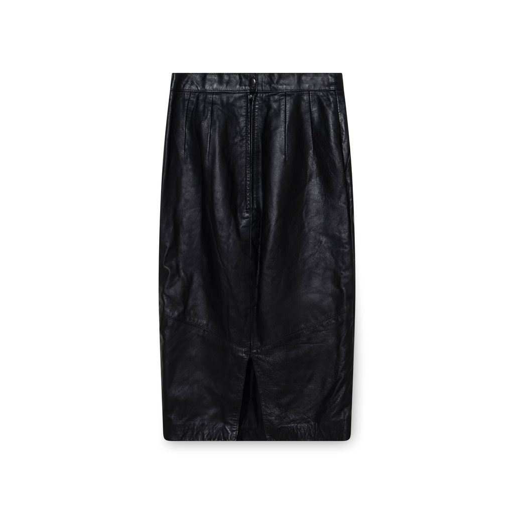 Pelle Cuir leather skirt features a midi A-line cut, a slit at the front, and a button zipper enclosure at the back.