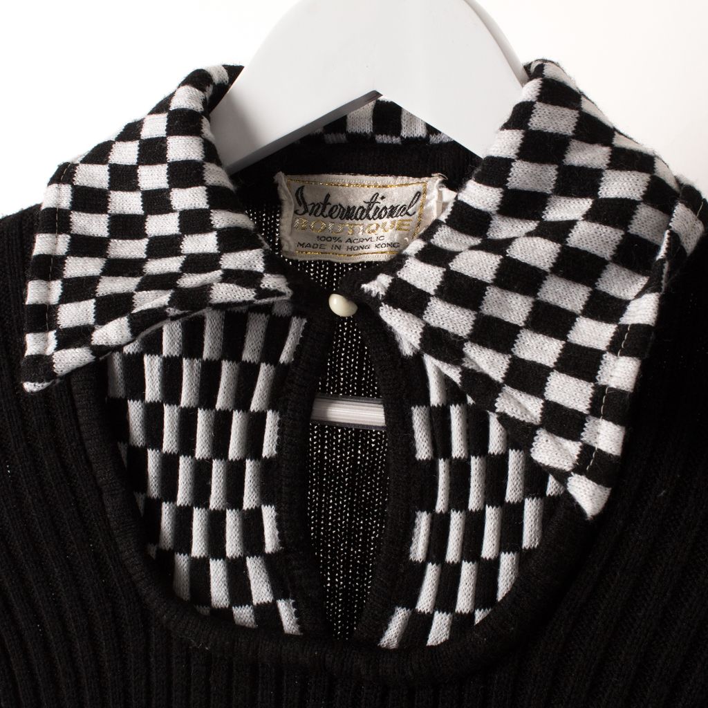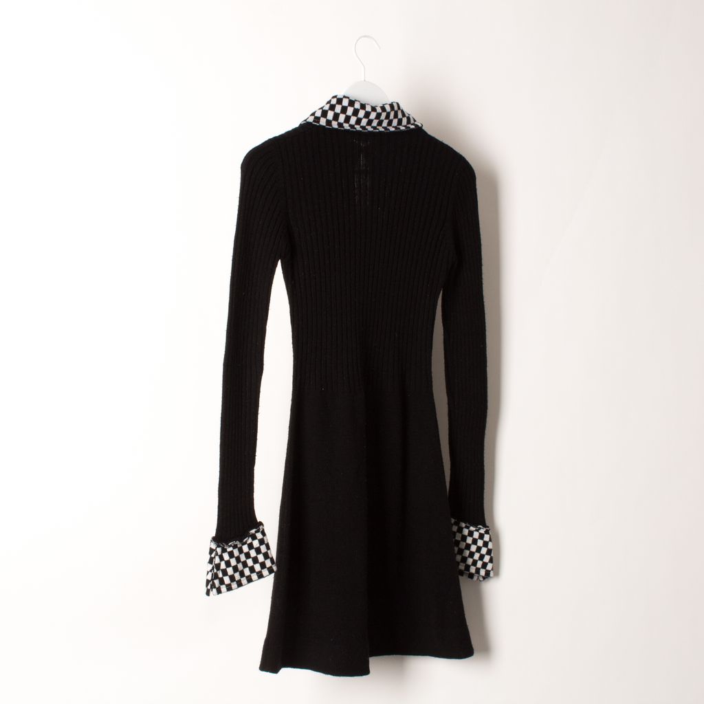 Vintage Midi Dress with a knit look, 100% acrylic, featuring checkered peter pan style collar, and checkered ribboning on sleeves.