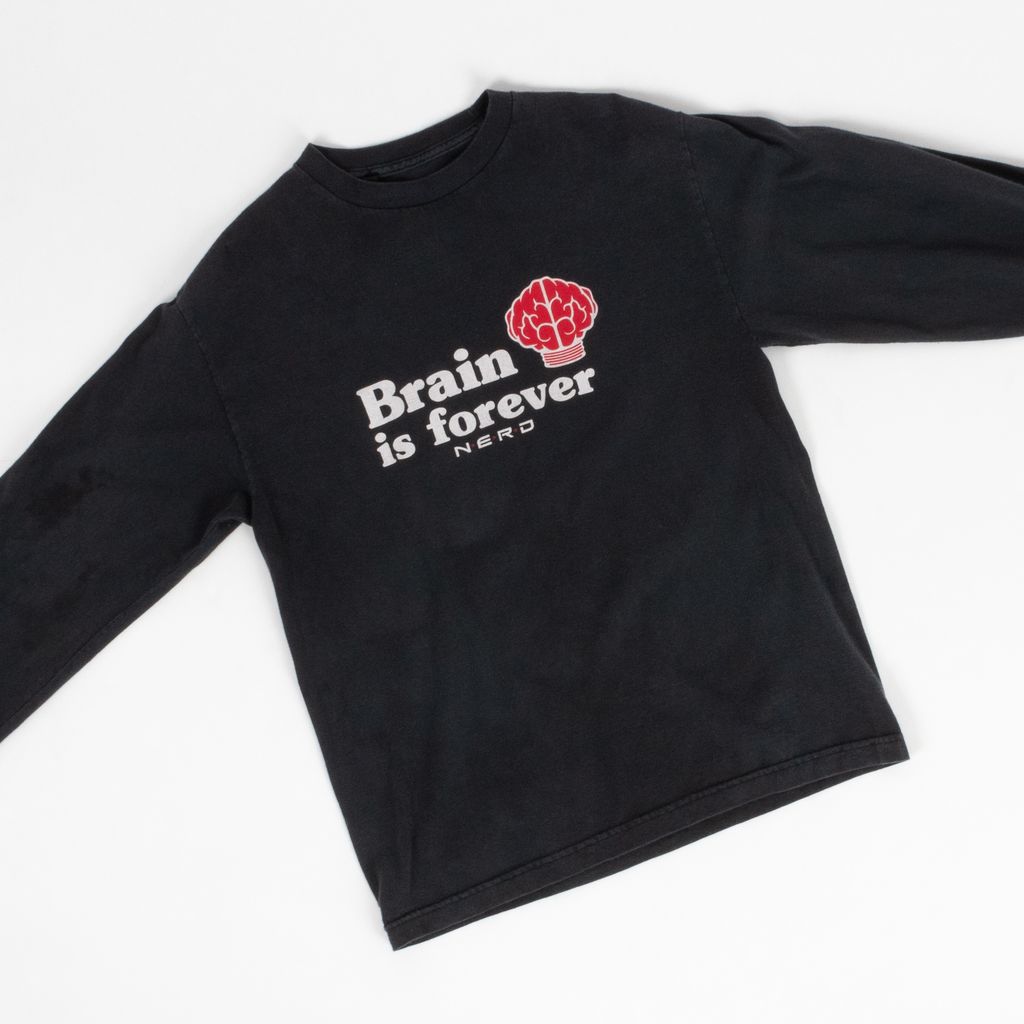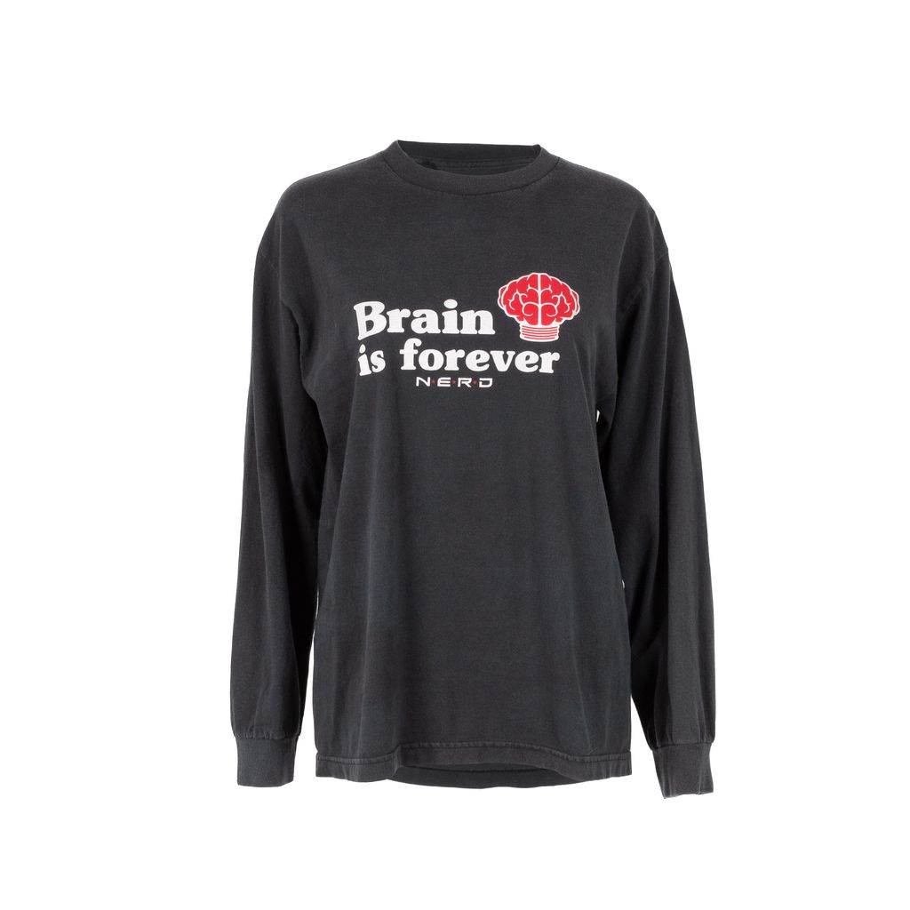 Going from production for others to making their own music, this long sleeve shirt commemorates the N.E.R.D musical legacy that continues to influence musicians worldwide. Features washed black body, relaxed fit, "Brain is Forever" graphic on chest, and minor signs of wear. Signs of wear include discoloration on arm as photographed.
