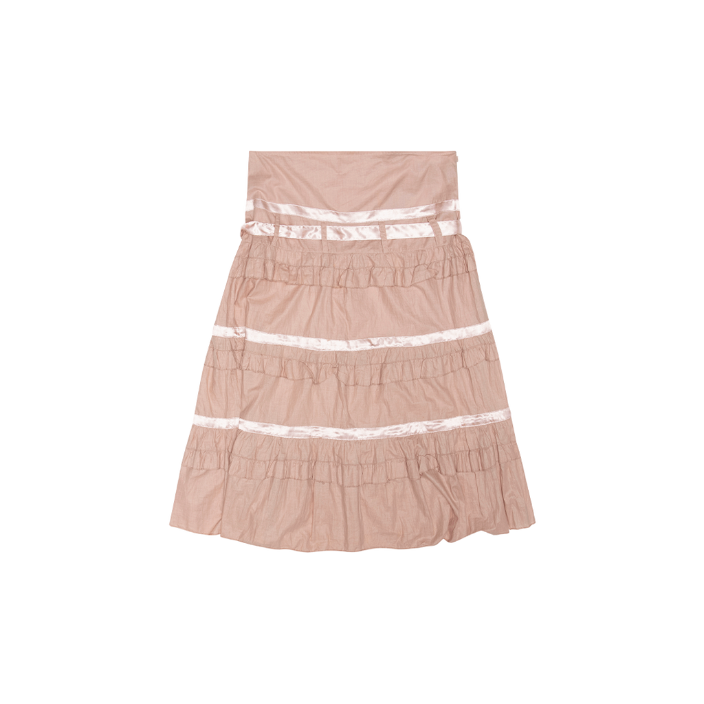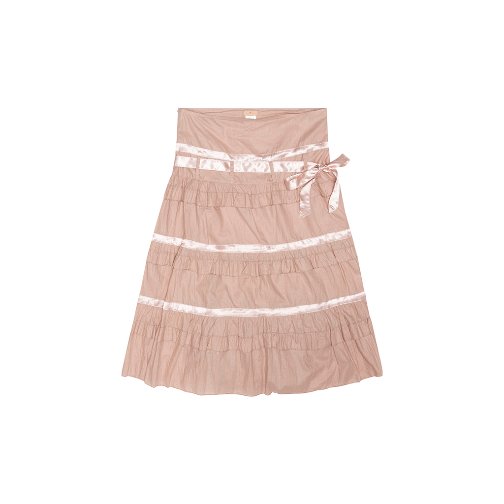 Vintage Pink Skirt features back zip closure, triple ruffle layer, and front tie detail.