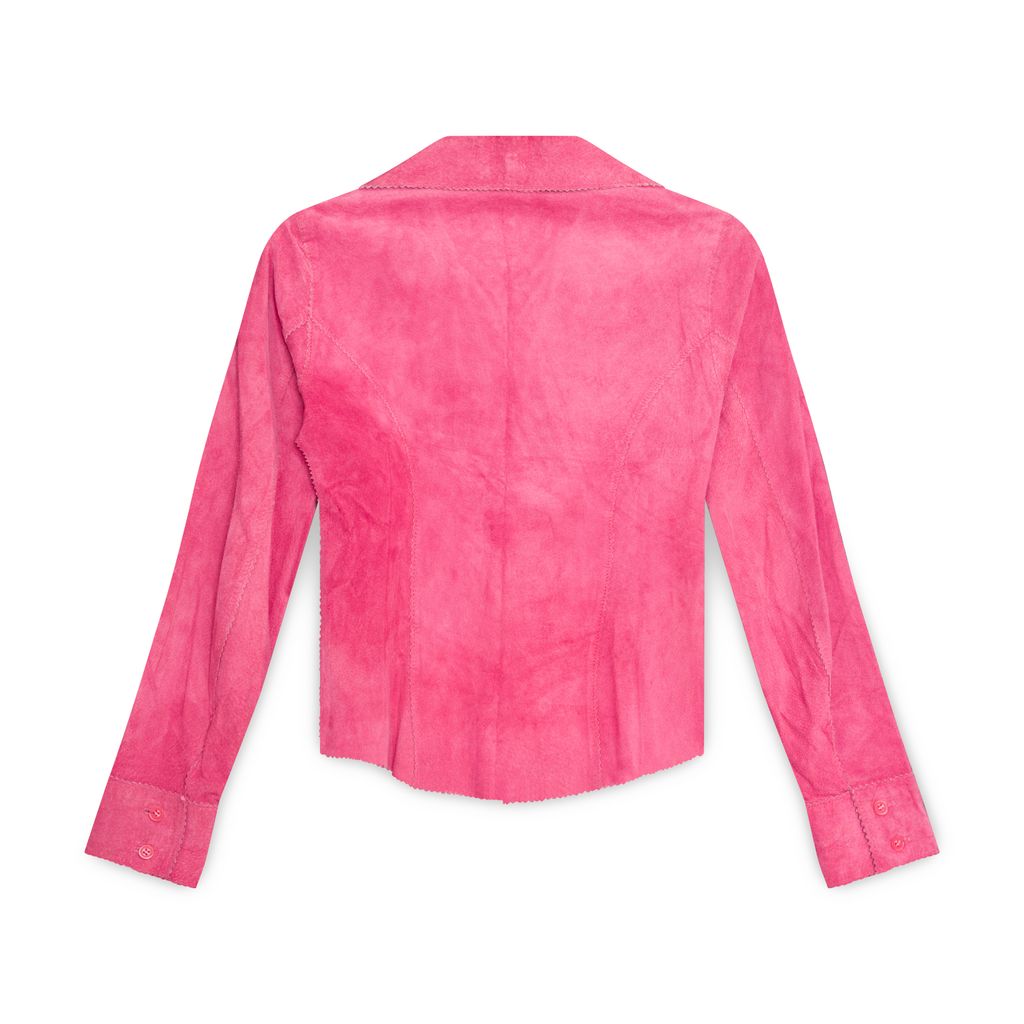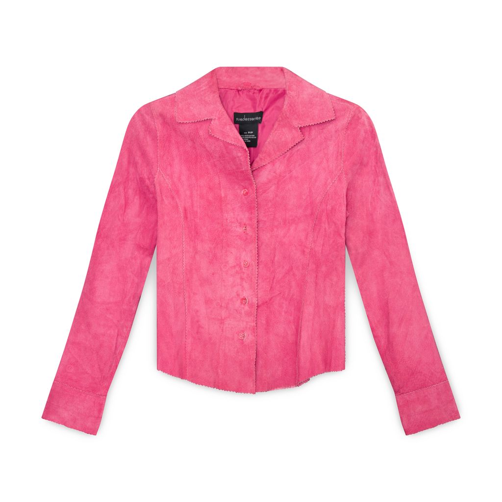 Vintage Pink Suede Button Up Top features button up closure, adjustable cuffs, slight ruffle detail throughout.