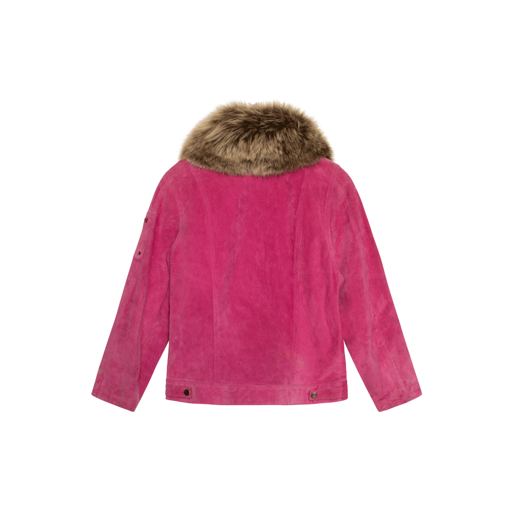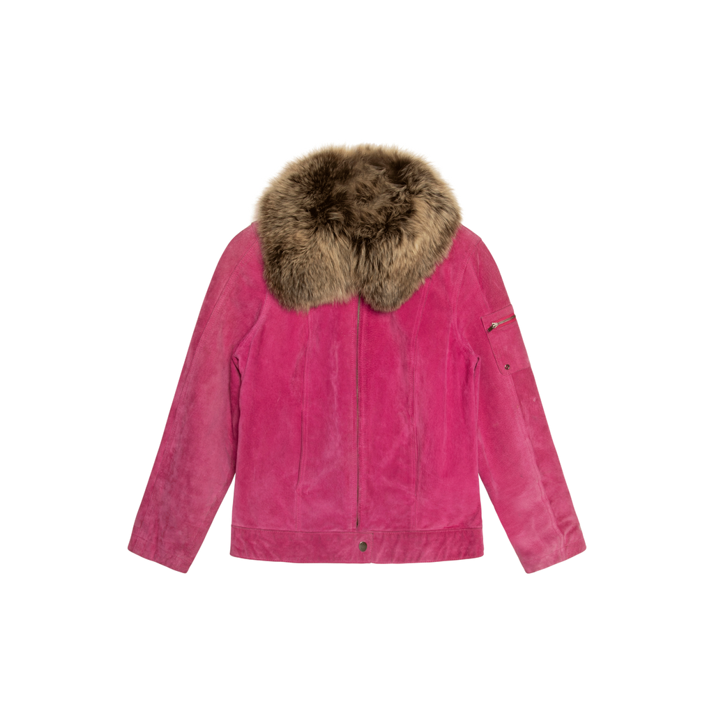 Vintage Pink Suede Jacket with Fur Collar features real fur collar, front zip closure, 2 side pockets, and one zippered patch pocket on left sleeve.