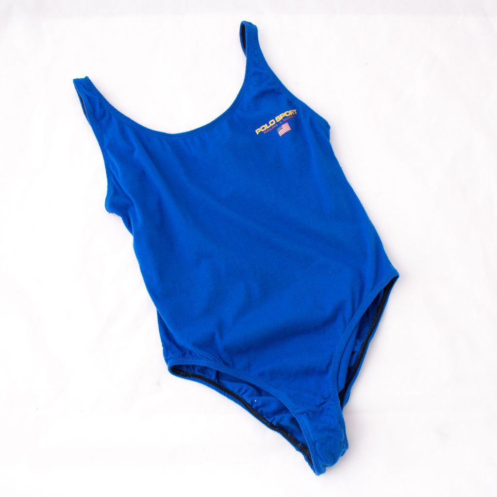 Vintage Polo Sport swimsuit, gently worn. Blue, featuring a front screen print graphic on chest. Perfect for the season!