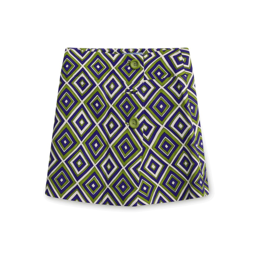 Vintage Prada Diamond Pattern Wrap Skirt in Purple/Green features green button enclosures.