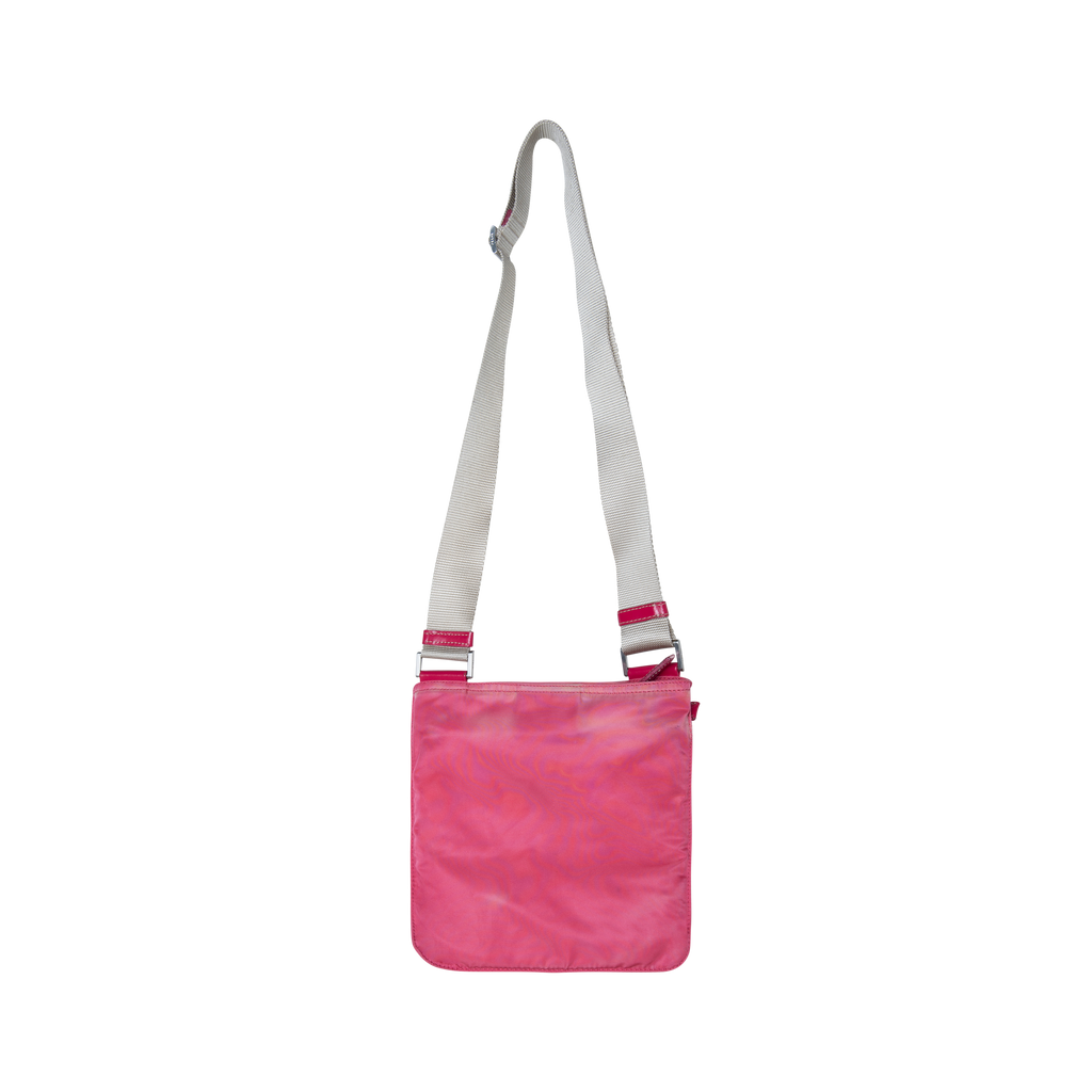 Vintage Prada nylon crossbody bag features single exterior zip pocket with logo at front, single zip closure at top, and adjustable shoulder strap.