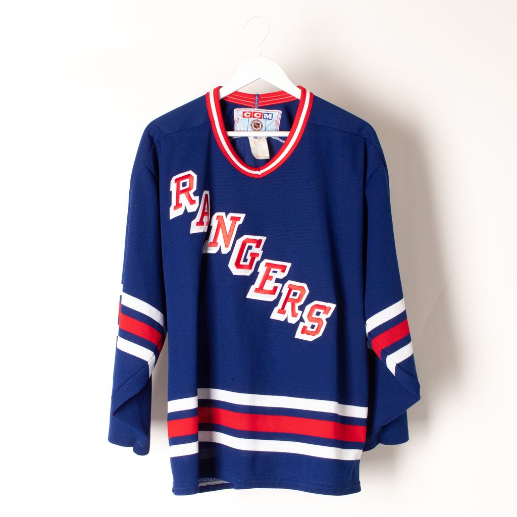 In good vintage condition, hockey jersey from the Rangers. Embroidered lettering across the front, v-neck collared finish, mesh material 100% polyester.