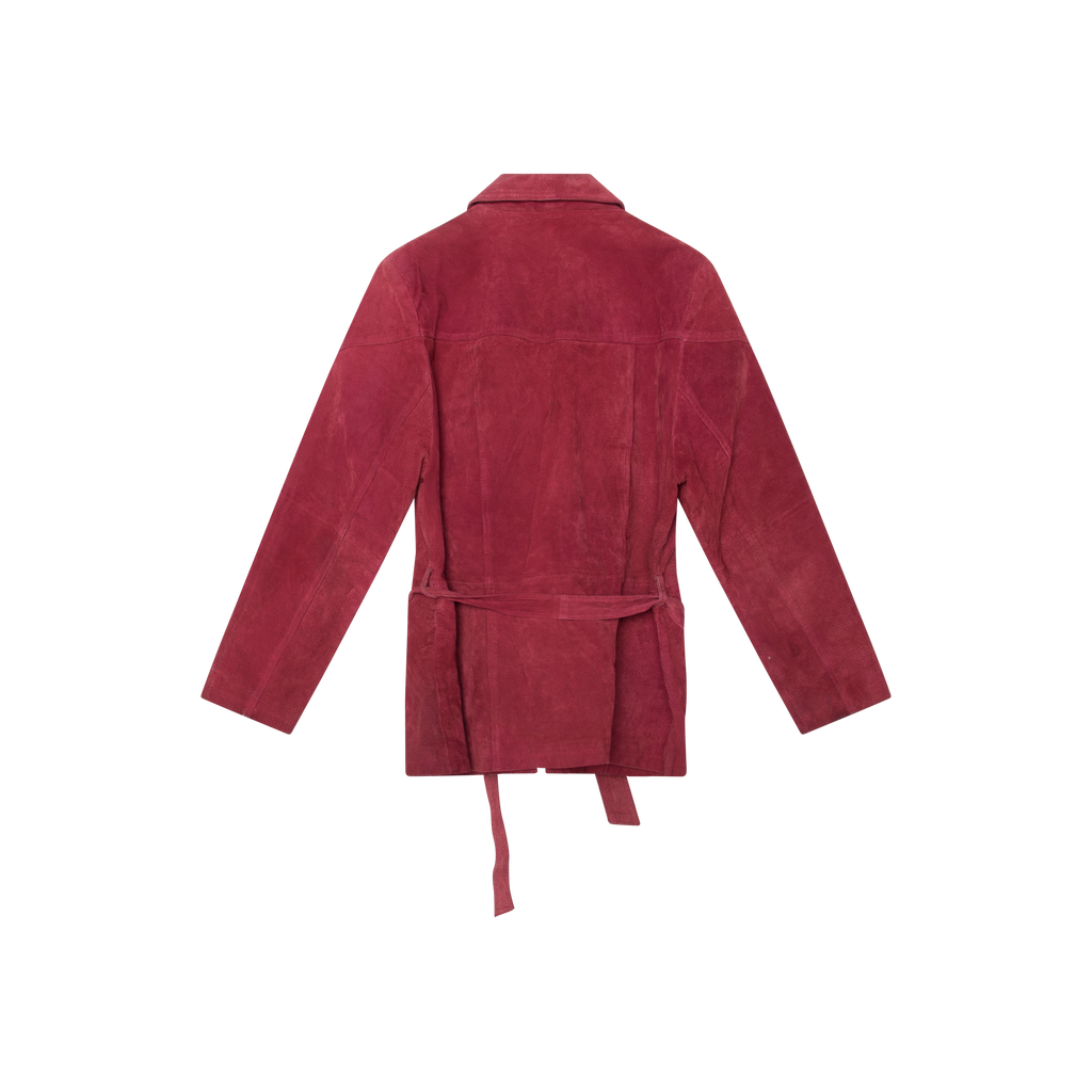 Vintage Red Suede Jacket features detachable belt, front zip closure, and 2 hexagonal front zip pockets.