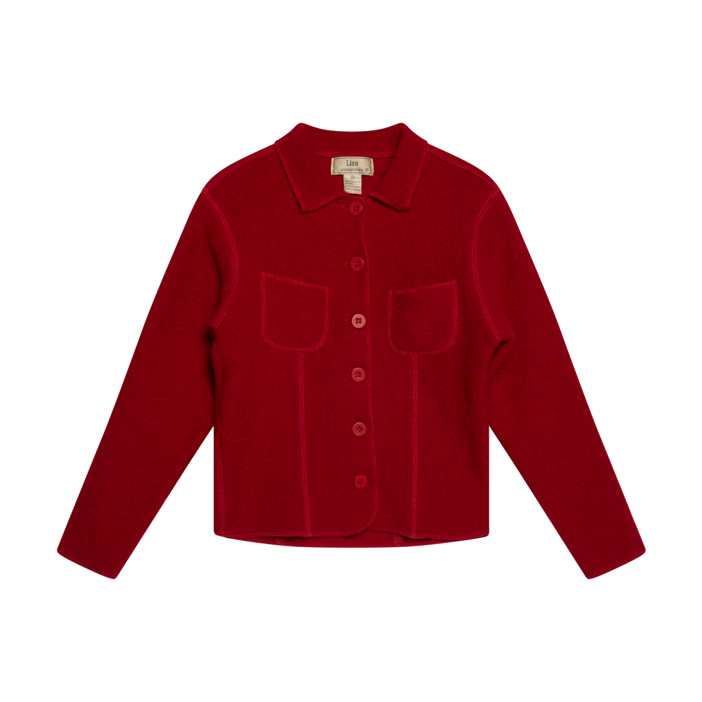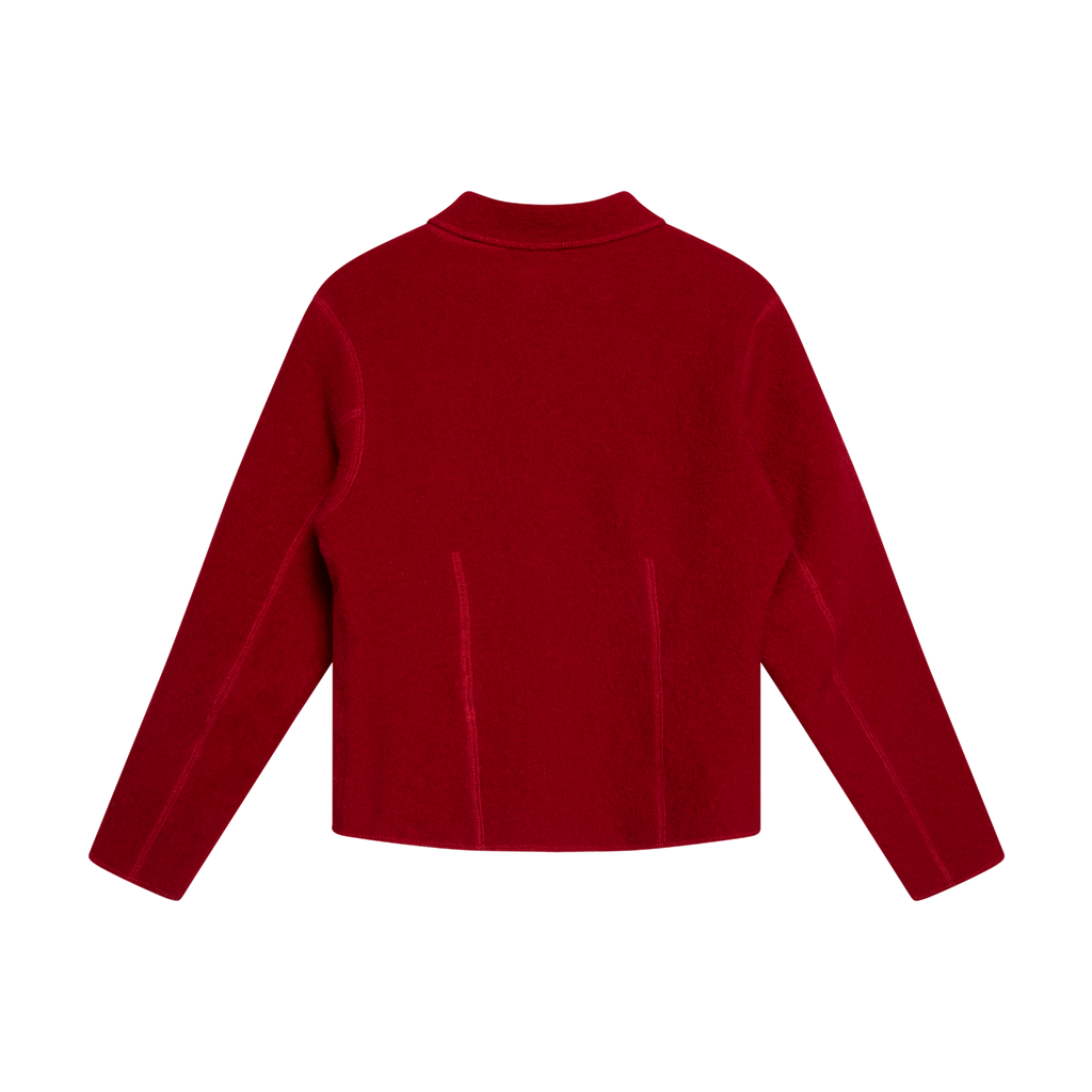 Vintage Red Wool Jacket features button closures and overlocking top stitched seams.