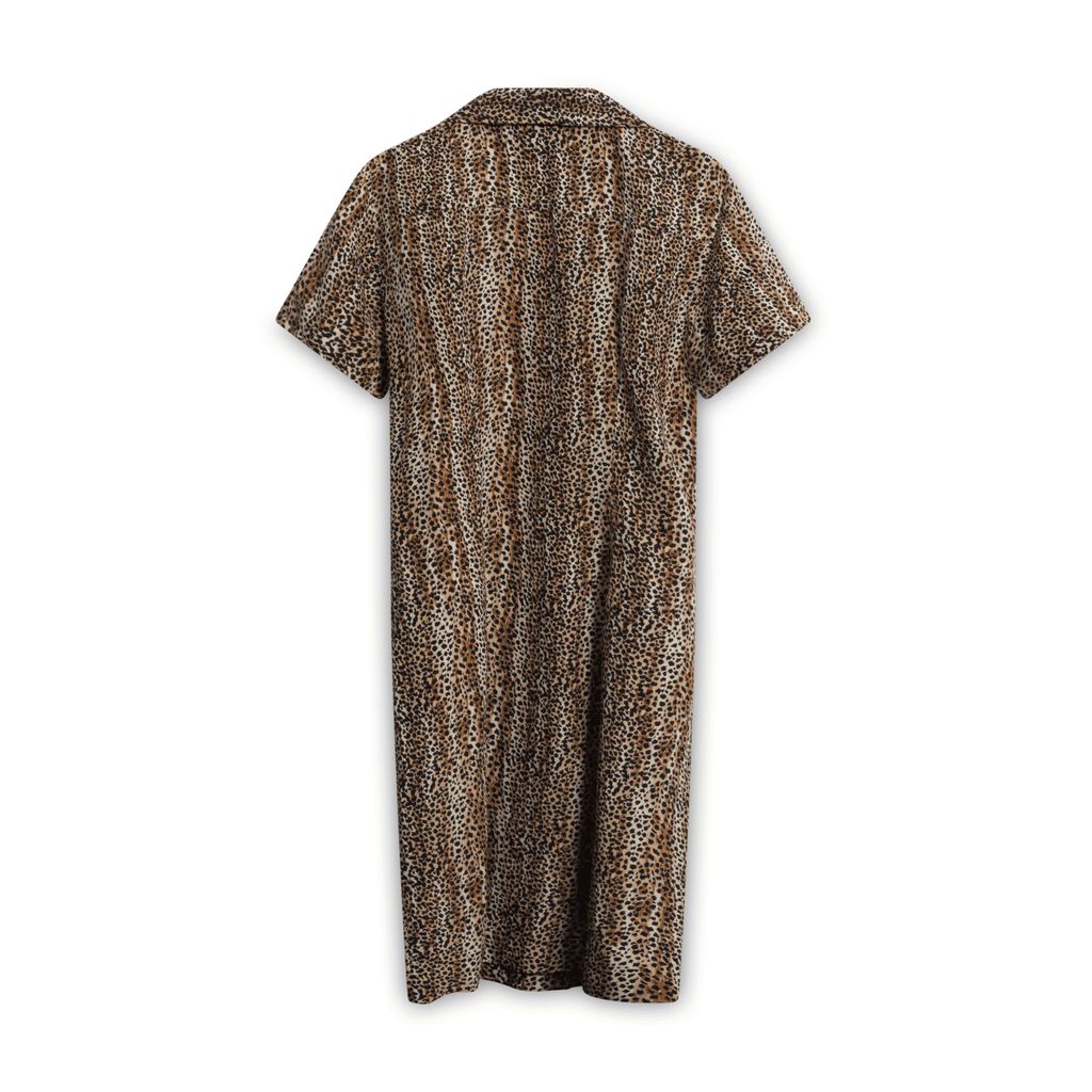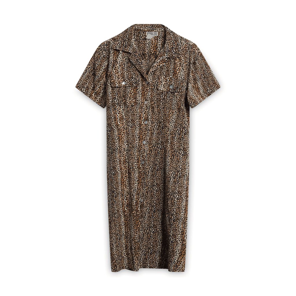 Short sleeve cheetah print dress with marble button enclosures and two buttoned pockets at the chest.