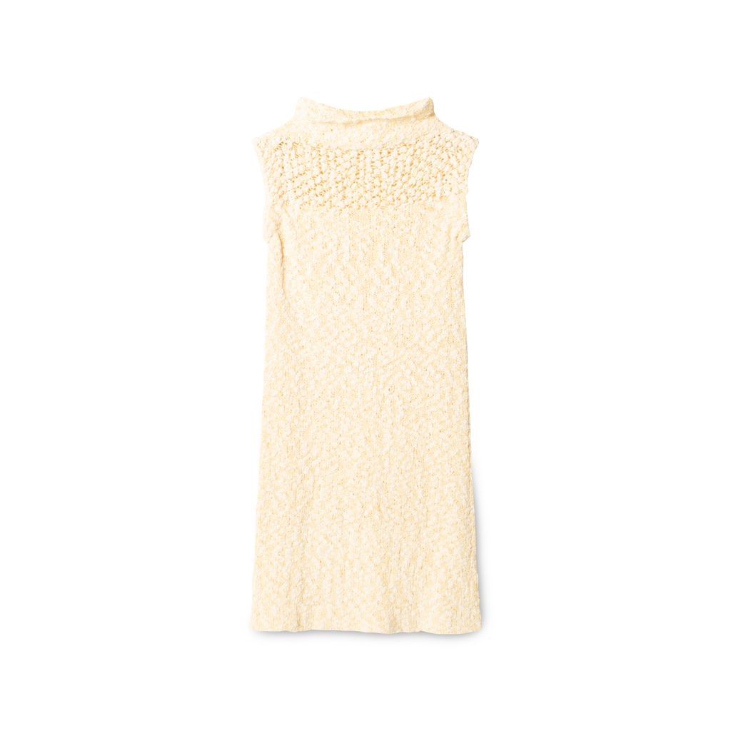 Vintage sleeveless knitted dress features mock neck and knitted pattern throughout.