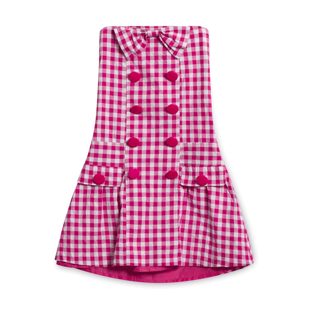 Features oversized chest bow and large decorative buttons