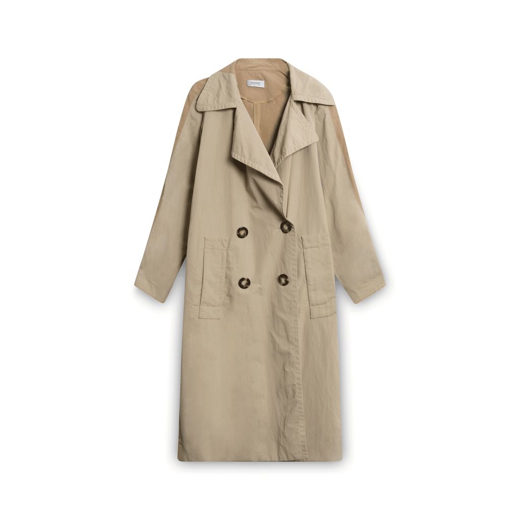 Vintage Sonia by Sonia Rykel Trench Coat in Tan features four-button closure, two-pocket silhouettes at the sides, and pocket on the back.