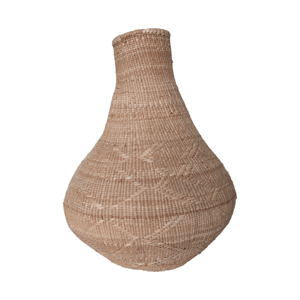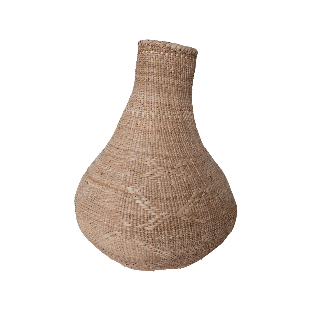 Vintage South African Buhera Basket features tight woven design with funnel neck.