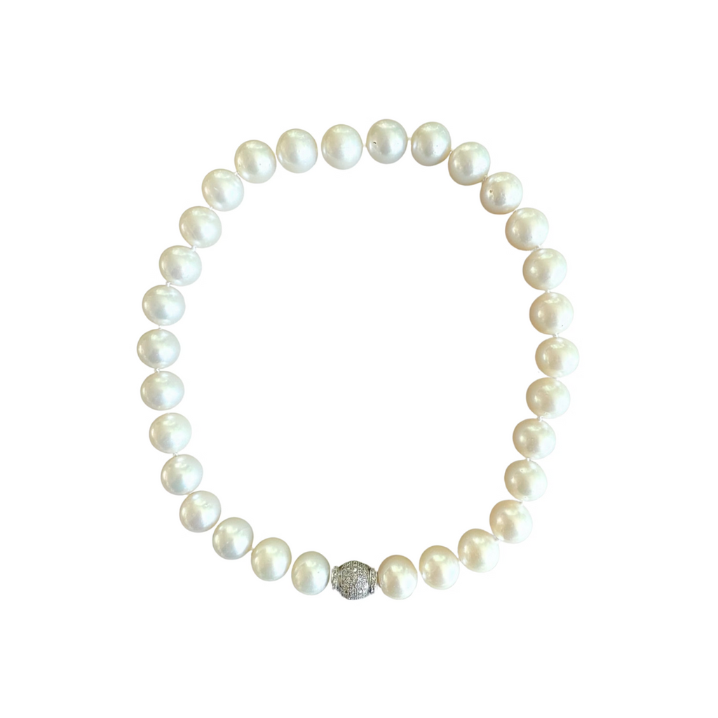 Exquisite in every detail , this statement necklace features 30 luminous South Sea pearls , each measuring approximately 13.5mm in diameter. The strand is secured by an 18k white gold ball clasp , pavé-set with diamonds and designed with a hidden screw closure. Measuring 17” in length and weighing 110 grams , this heirloom-worthy piece showcases the unparalleled beauty of South Sea pearls paired with the brilliance of fine diamonds. Wear it alone for elegant simplicity , or dress it up with an enhancer bale pendant for a more personalized statement.