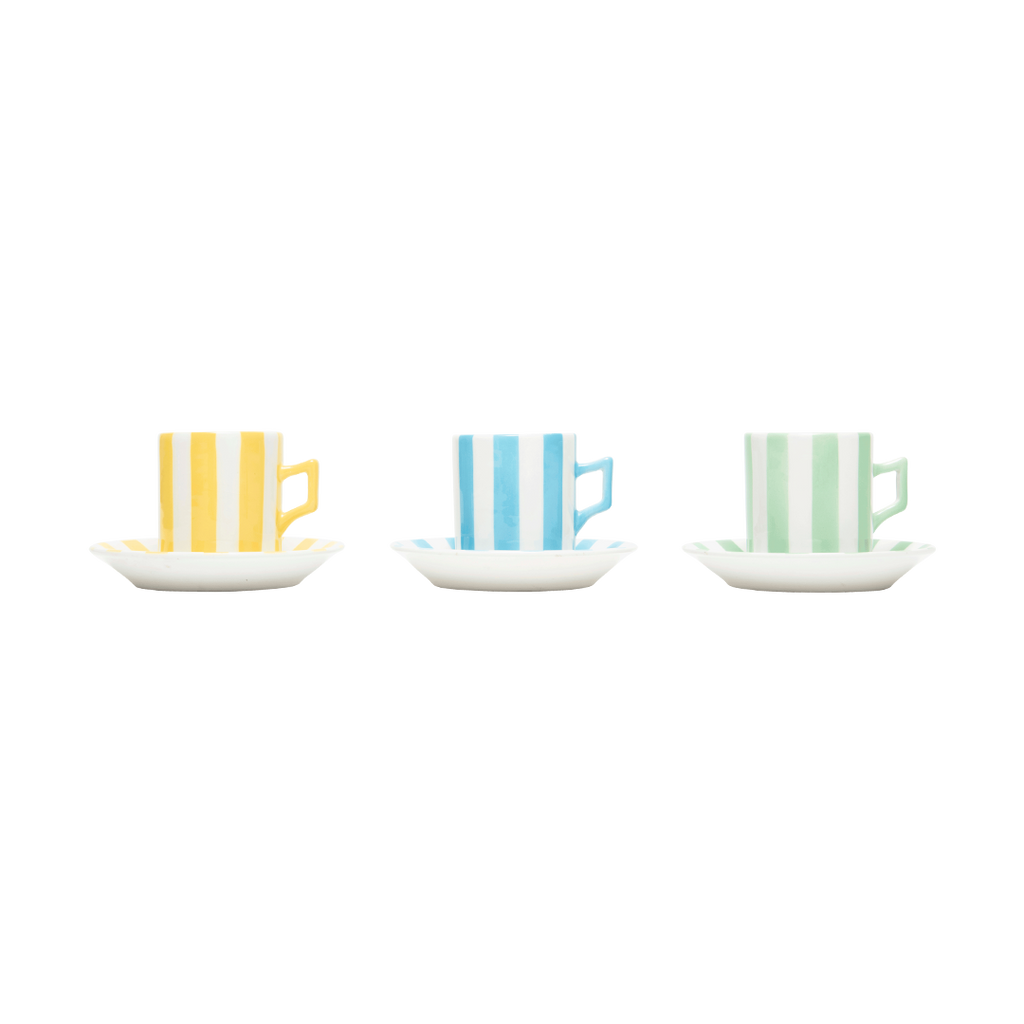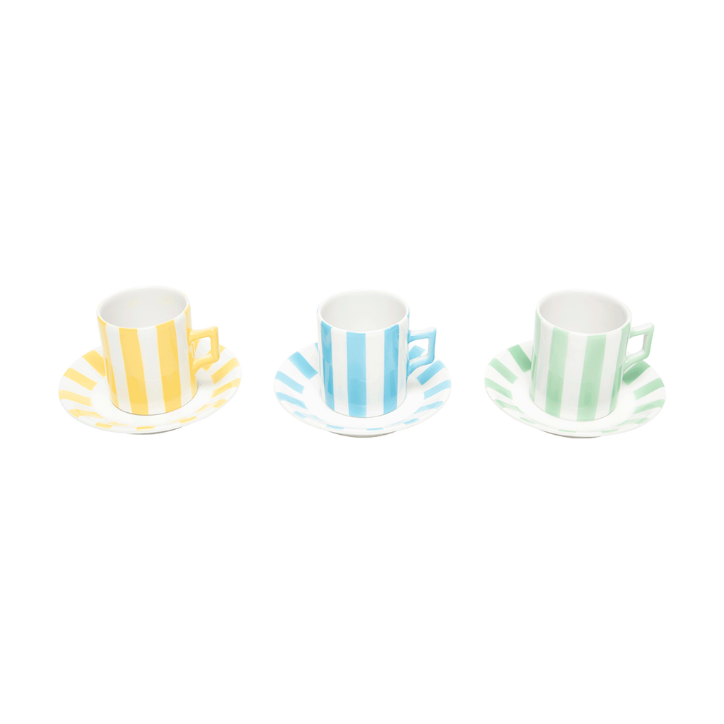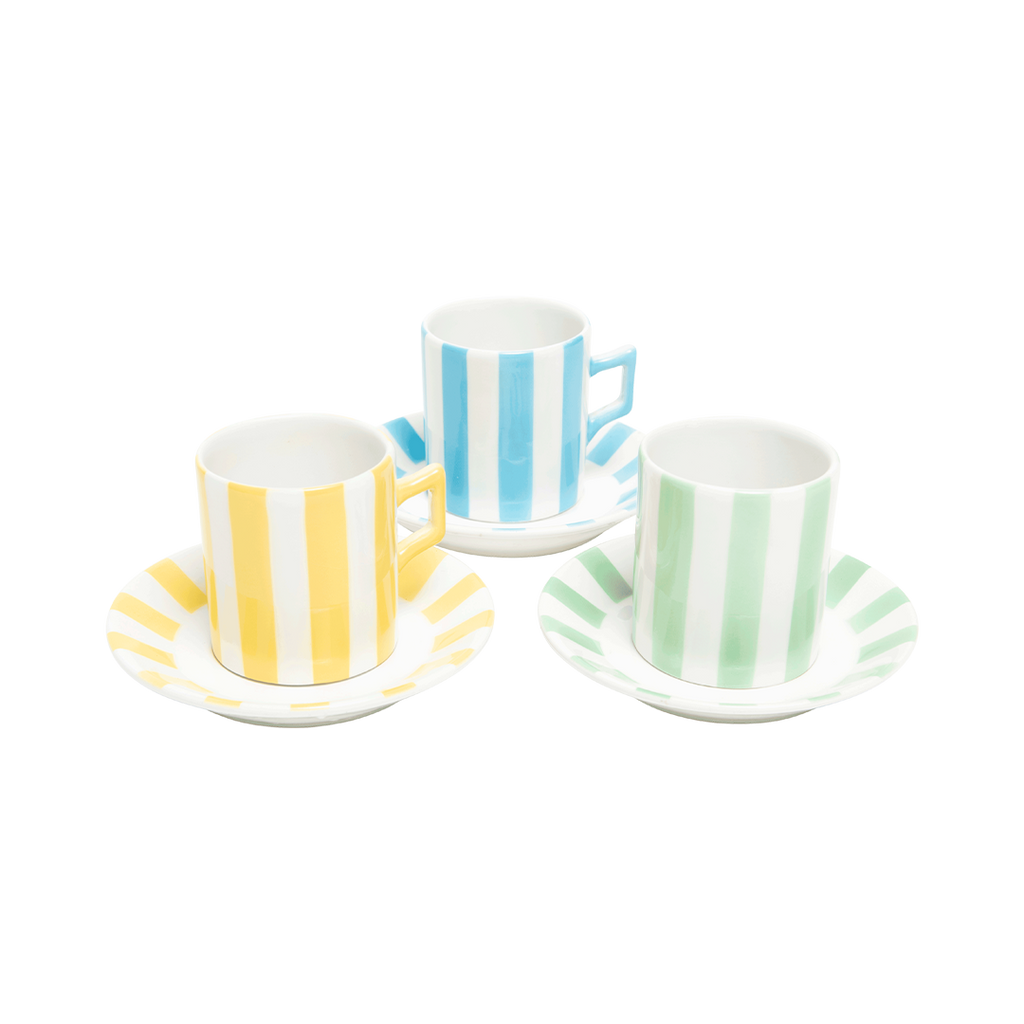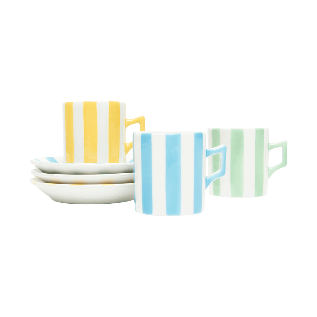 Vintage Striped Italian Espresso Cup and Saucer Set for Anita Kott is a set of striped espresso cups and matching saucers, produced in Italy in the 1960s for Anita Knott. Hand signed and comes with a set of 3 cups and 3 saucers.